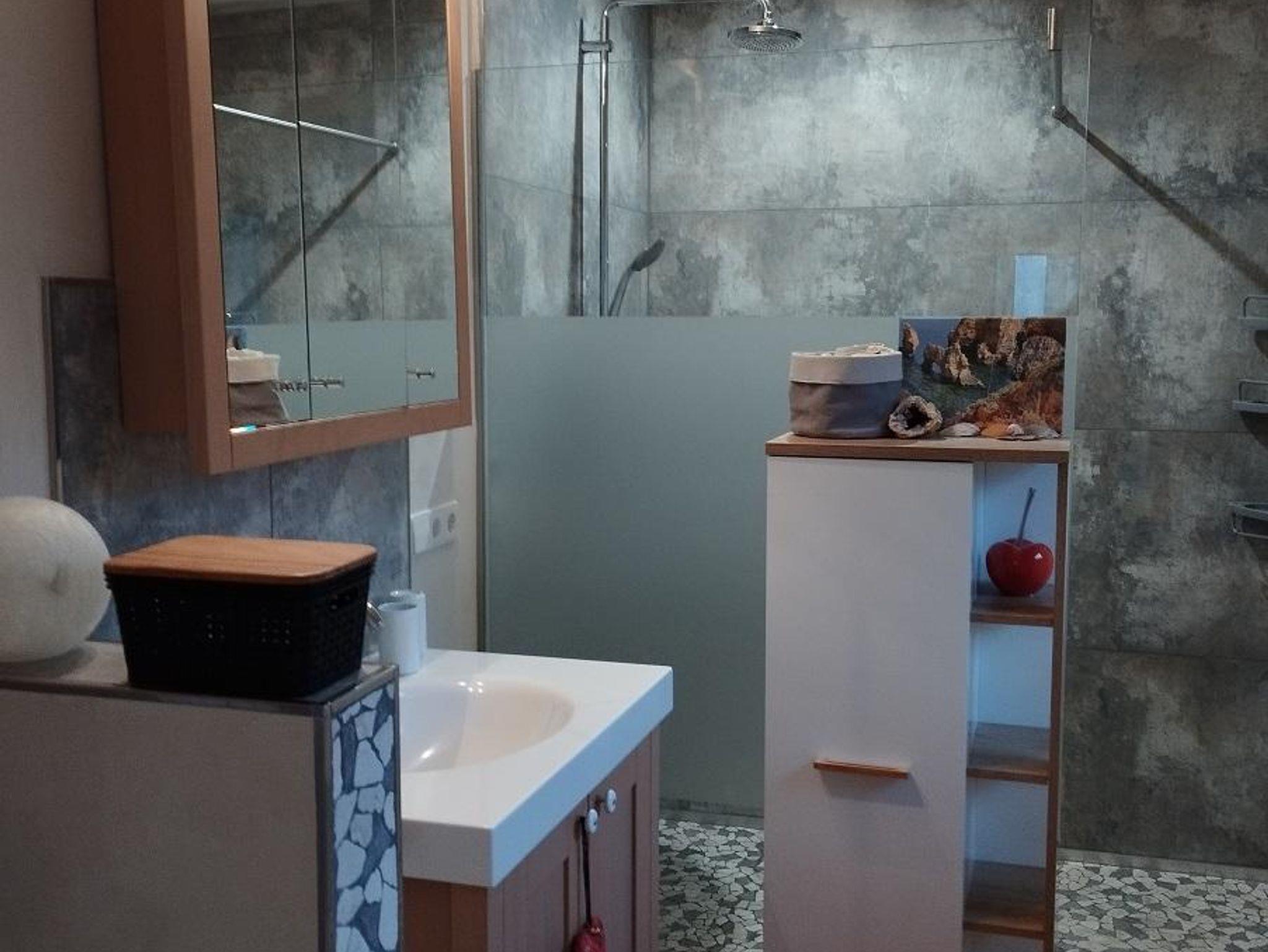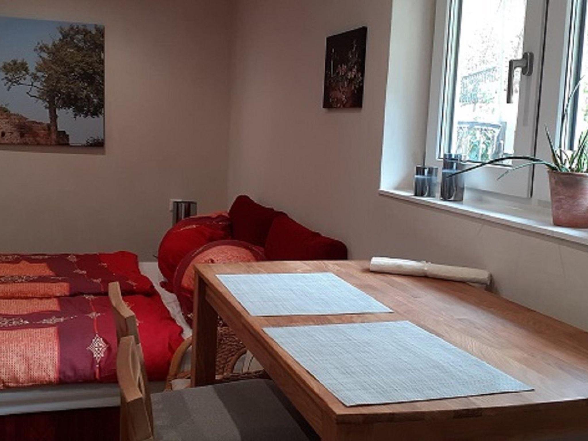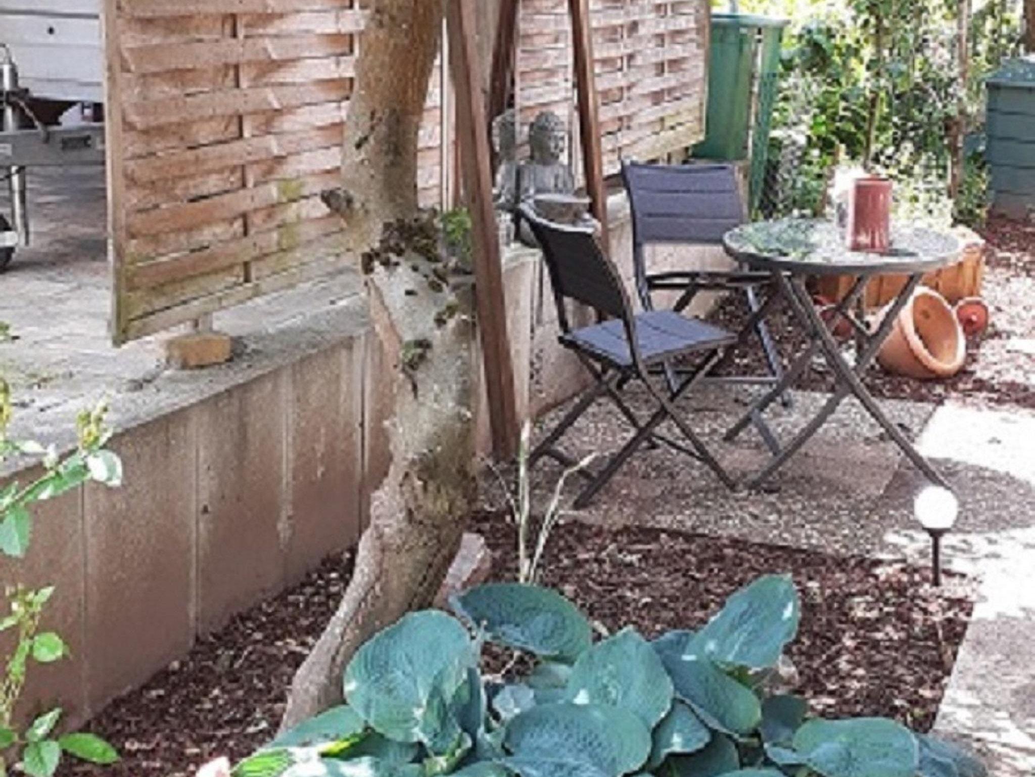 Unsere Ferienwohnung besteht aus einem Wohn-/Schlafraum mit Küchenbereich und einem großen Badezimmer mit bodengleicher, extragroßer Dusche. Die Wohnung erreichen sie über drei Stufen vor der Haustüre, im Innern mit separatem Eingang. Vorm Haus und im Garten gibt es gemütliche Sitzgelegenheiten.