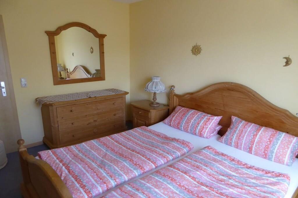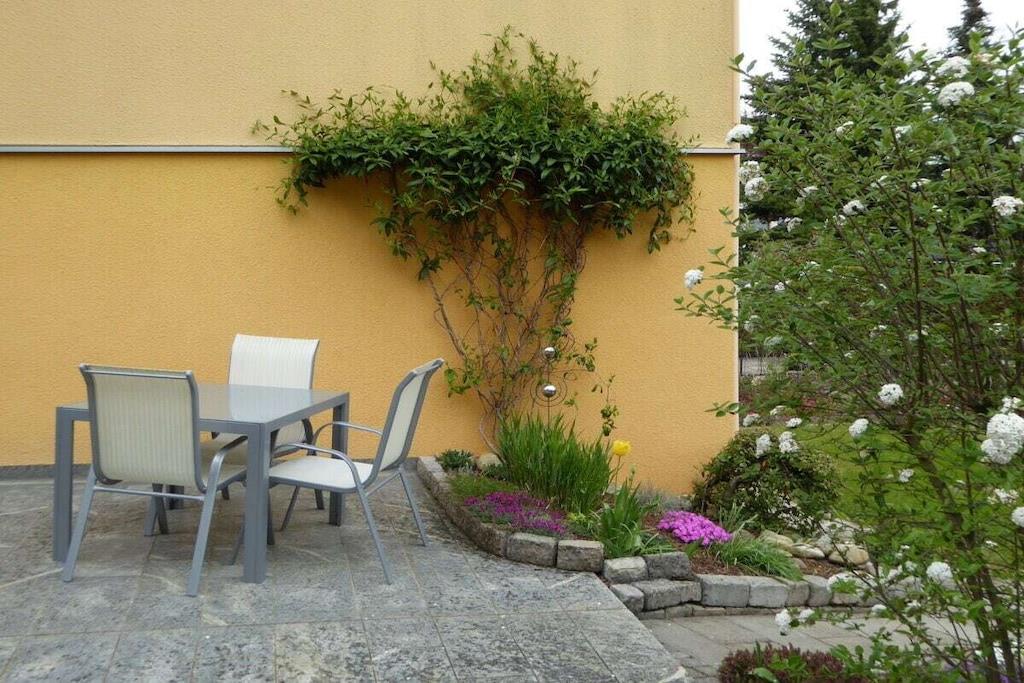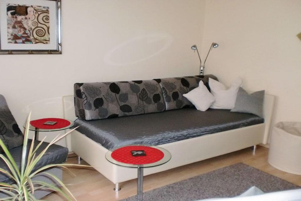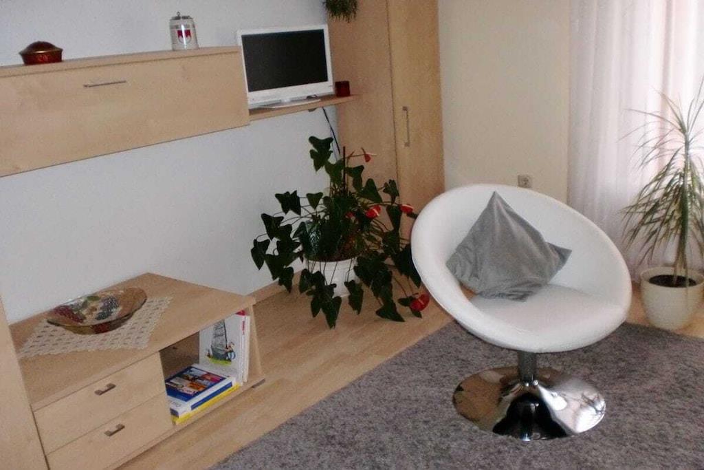 Dear guests, my apartment is 45m² in size and offers optimal comfort for three vacationers. Your apartment is lovingly and carefully furnished. The fully equipped kitchen includes a microwave, oven, coffee maker, kettle, toaster, and a small seating area. All rooms have natural light and a view of the garden. A sunny terrace opens onto your separate entrance. The apartment has a bedroom with a double bed, a wardrobe, and a chest of drawers. The living room has a single bed that can also be used as a couch, as well as a wardrobe, among other furniture. Both rooms have a television. Of course, you also have free Wi-Fi access. Free parking is available on the street.