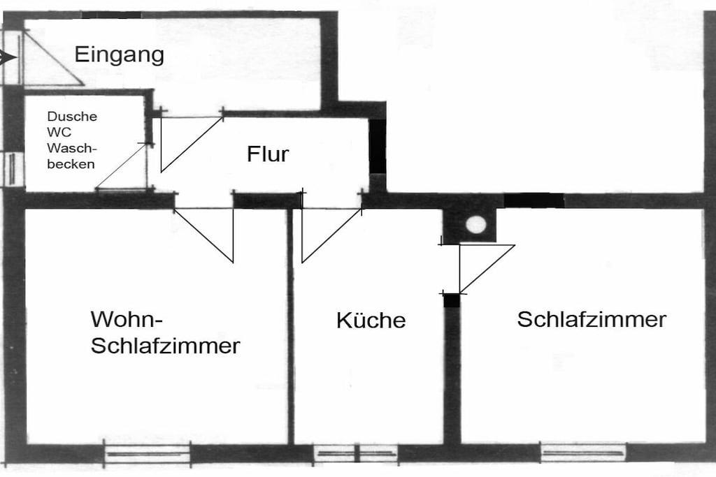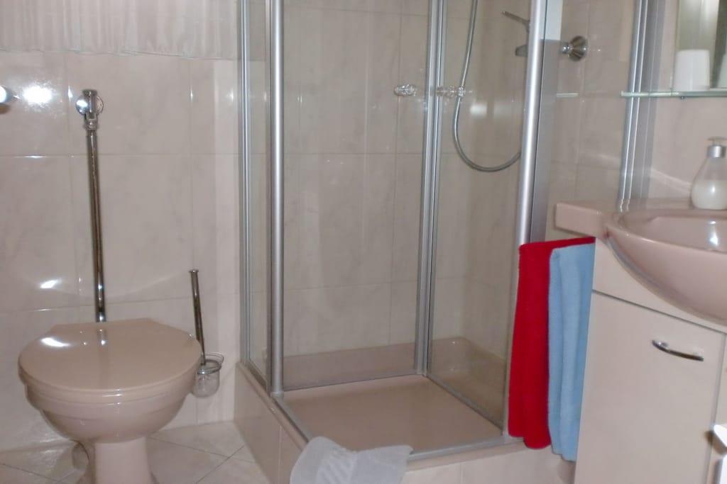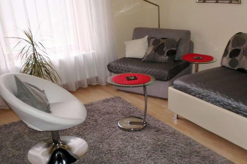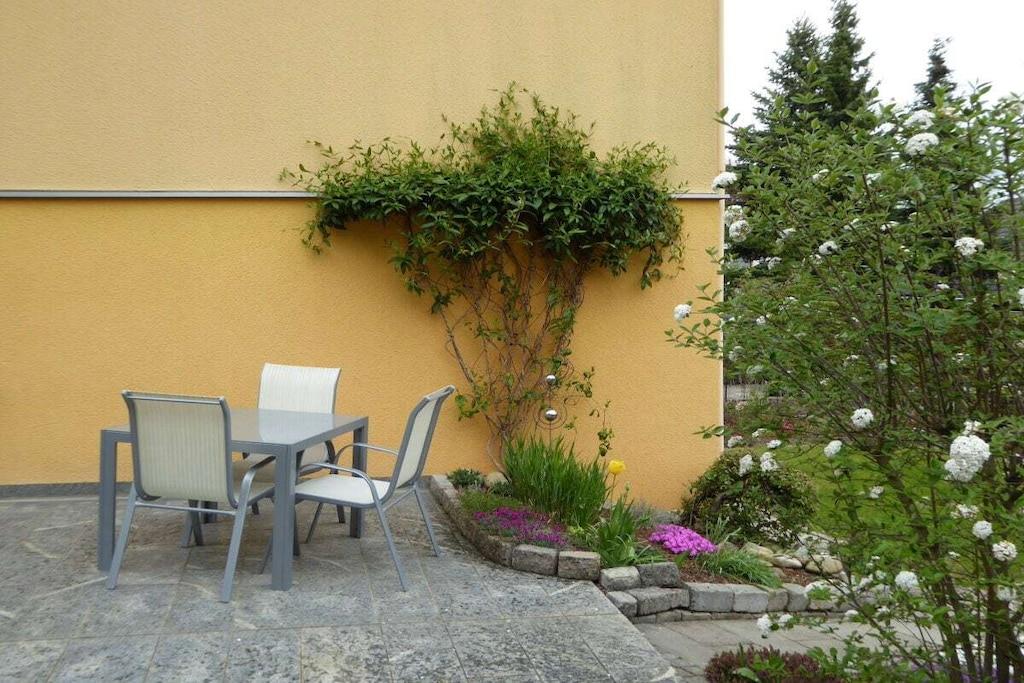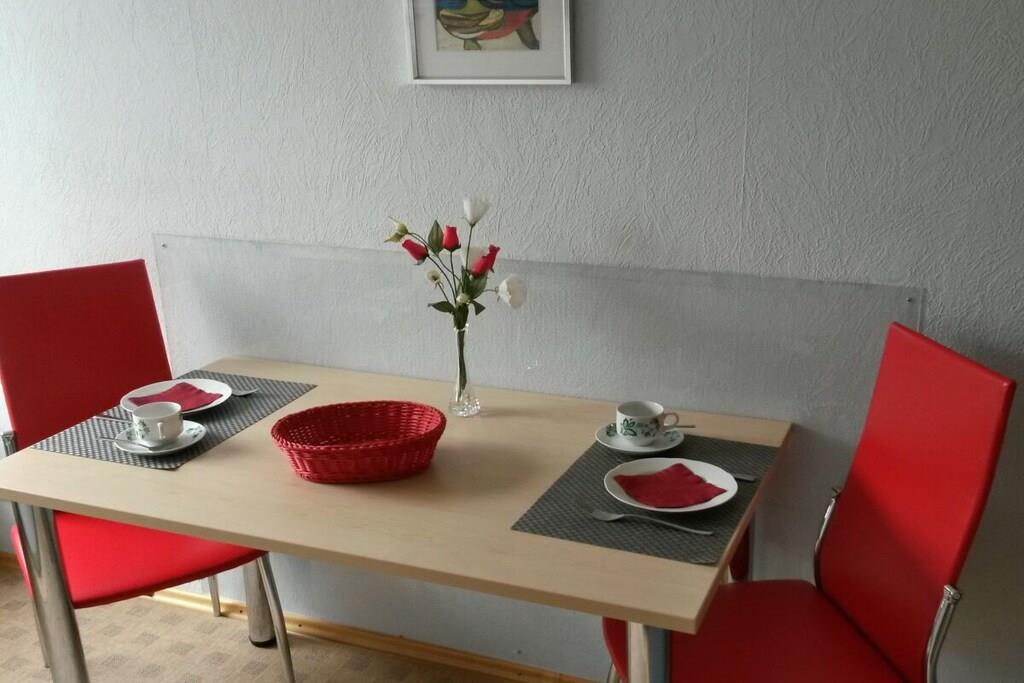 Dear guests, my apartment is 45m² in size and offers optimal comfort for three vacationers. Your apartment is lovingly and carefully furnished. The fully equipped kitchen includes a microwave, oven, coffee maker, kettle, toaster, and a small seating area. All rooms have natural light and a view of the garden. A sunny terrace opens onto your separate entrance. The apartment has a bedroom with a double bed, a wardrobe, and a chest of drawers. The living room has a single bed that can also be used as a couch, as well as a wardrobe, among other furniture. Both rooms have a television. Of course, you also have free Wi-Fi access. Free parking is available on the street.