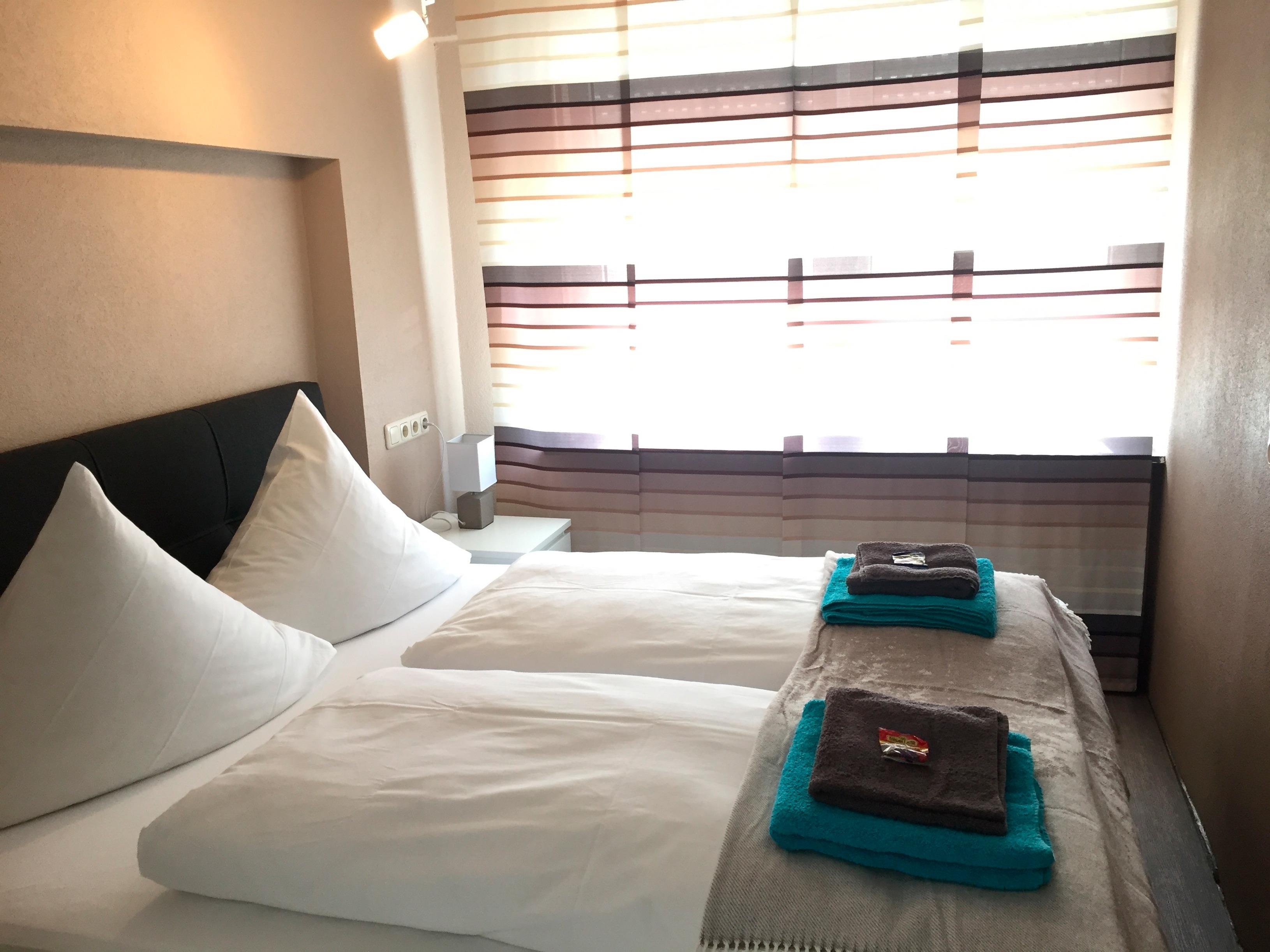 2 Schlafzimmer (9 und13 m²) für jeweils 2 Erwachsene mit Boxspringbett (180 x 200cm), Kleiderschrank, Kommode und Ablagen.