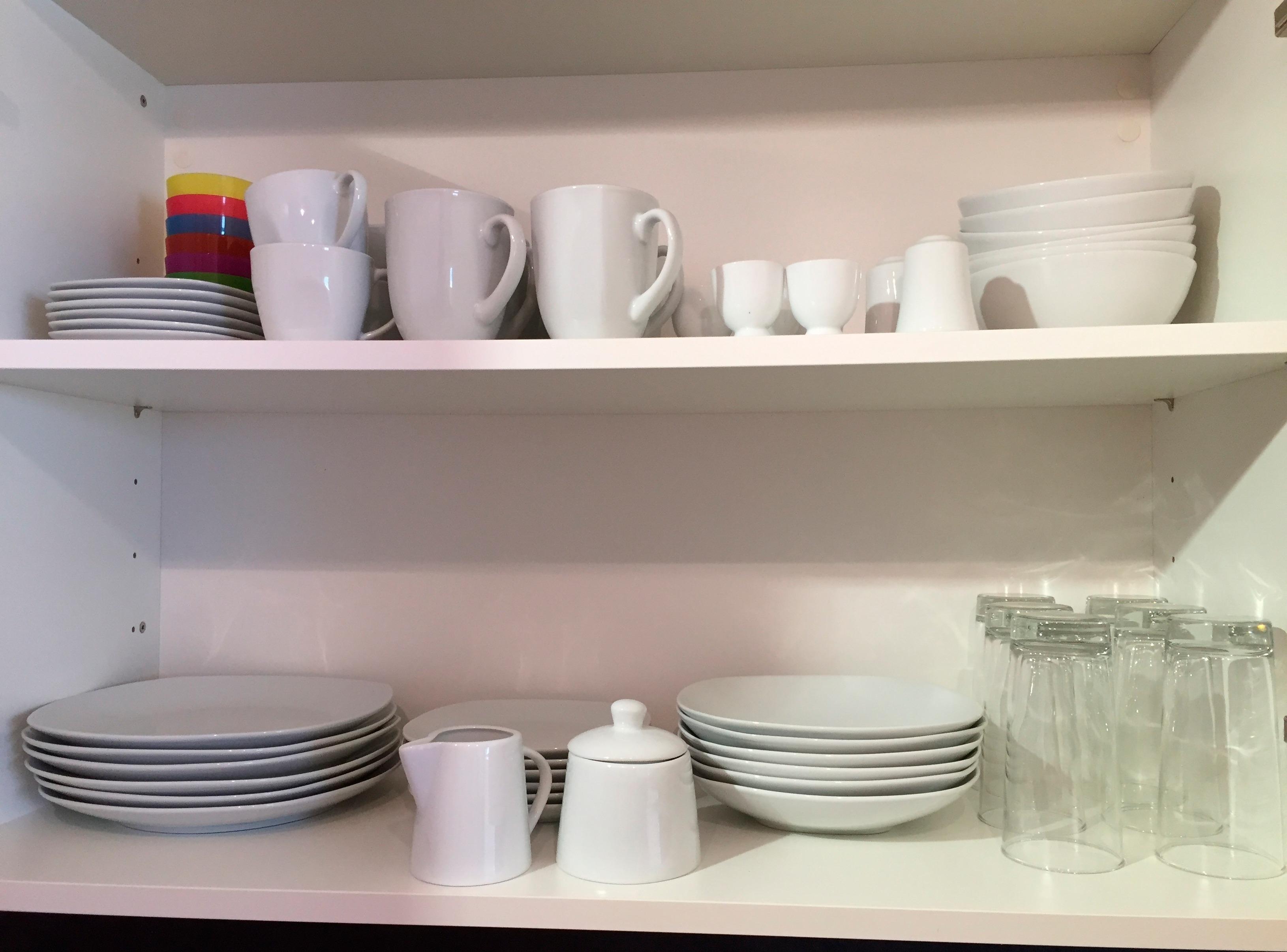 Neue moderne Küche mit Essbereich, Kühlschrank mit Eisfach, Ceran-Kochfeld, Spülmaschine, Mikrowelle, Toaster, zwei Kaffeemaschinen (mit Filter und Pads), ausreichend Geschirr und Gläser, Waschmaschine.