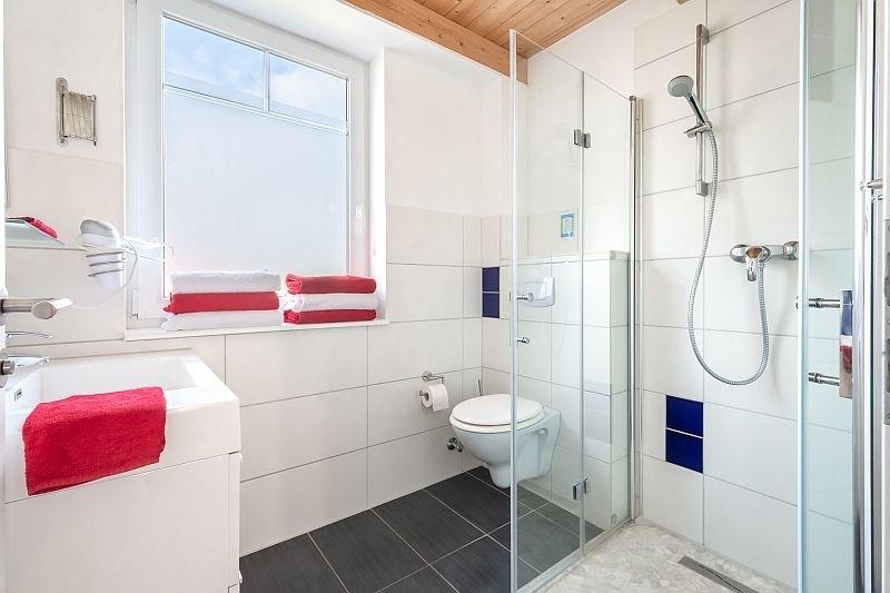 Der großzügige Wohn-/Essbereich ist gemütlich ausgestattet und bietet reichlich Platz für bis zu 4 Personen. Die integrierte Einbauküche ist komfortabel mit Ceranfeld, Backofen, Kühl-/Gefrierkombination, Geschirrspüler, Kaffeemaschine, Wasserkocher, Toaster und 12-fach Geschirr ausgestattet. Auf derselben Ebene befinden sich außerdem ein Schlafzimmer mit Doppelbett und ein geräumiges Duschbad mit Tageslicht. Über eine Treppe erreichen Sie ein weiteres Schlafzimmer mit Doppelbett sowie ein Schlafzimmer mit zwei Einzelbetten und ein Wannenbad mit Tageslicht. Die Wohnung ist komplett mit Laminat ausgelegt und mit Echtholzmöbeln ausgestattet. Vom Wohnzimmer und den oberen Schlafzimmern können Sie ebenfalls die Ostsee sehen.