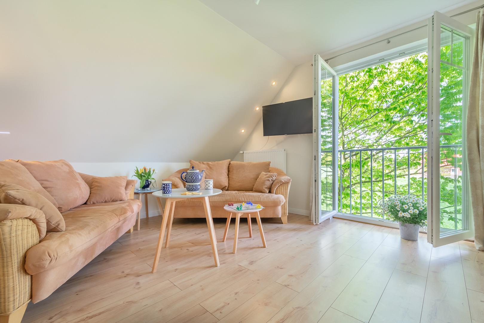 Die Wohnung "Sommerwiese" liegt im ersten Obergeschoss des Hauses "Sturmwind" und wurde 2012 komplett saniert. Sie bietet auf zwei Ebenen für 4 Personen viel Platz und ein gemütliches Ambiente im mediterranen Stil. Durch die großen, bodentiefen Fenster im Wohnzimmer haben Sie einen herrlichen Blick über die angrenzenden Felder und Wiesen und können hier den Sonnenuntergang genießen.