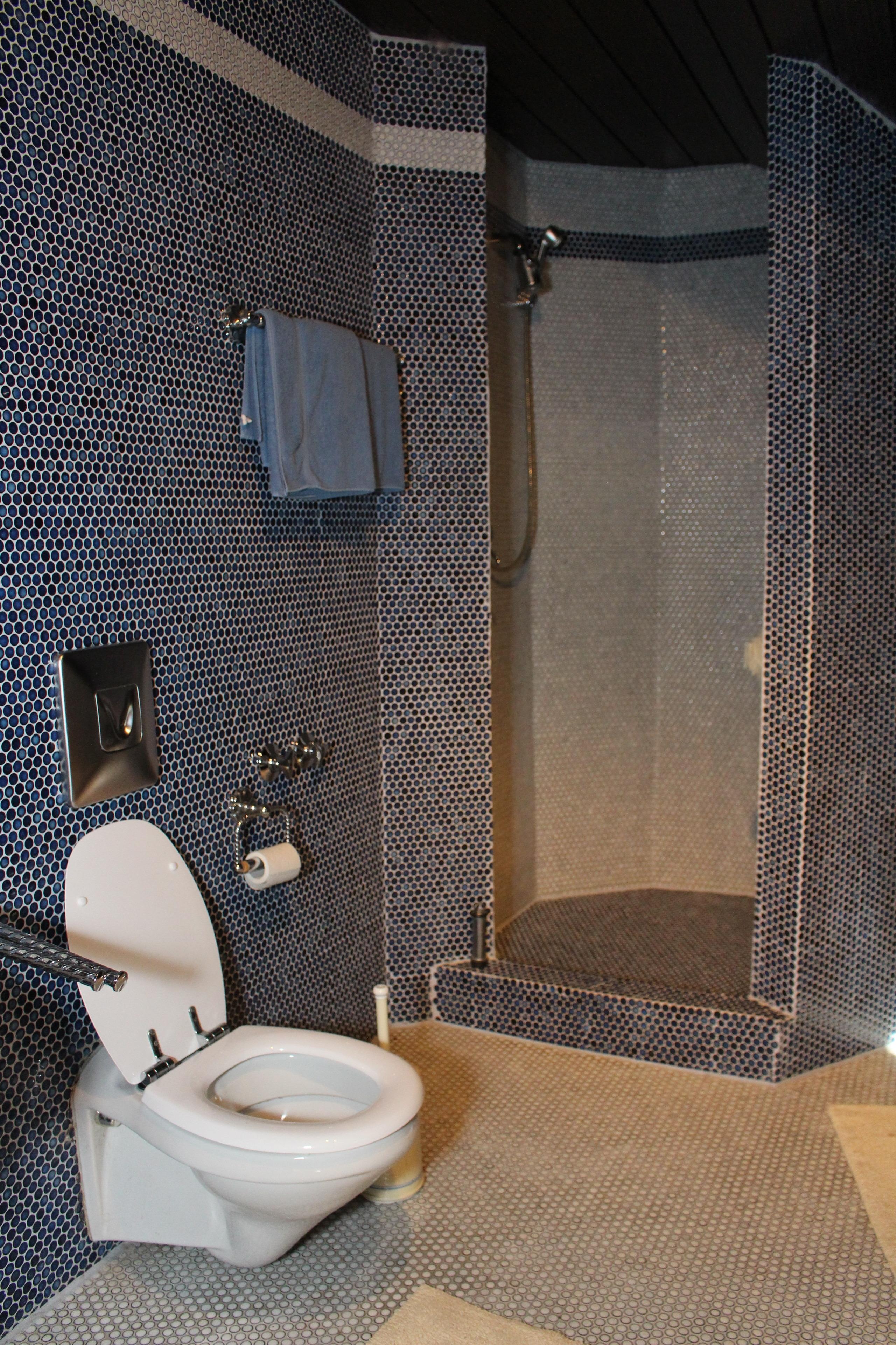 Das große marmorierte Badezimmer hat eine geräumige Dusche, eine Badewanne für zwei, WC und ein Doppelwaschbecken.