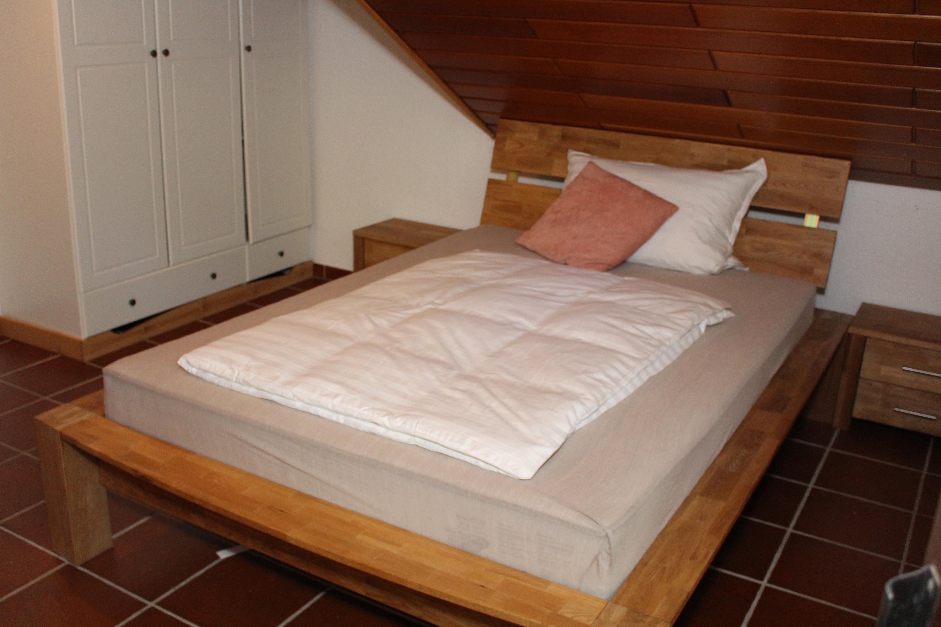 Das geräumige Schlafzimmer von ca. 40 qm hat einen offenen Dachstuhl mit viel sichtbarem Holz und einem großzügigen, fantastischen Blick auf den Pfälzer Wald.