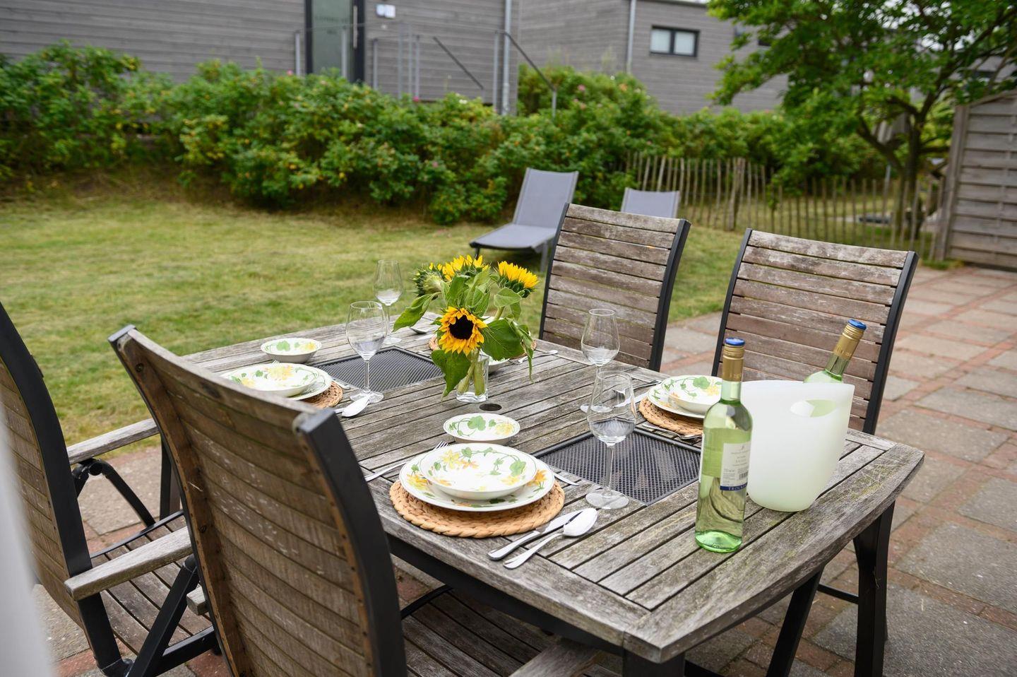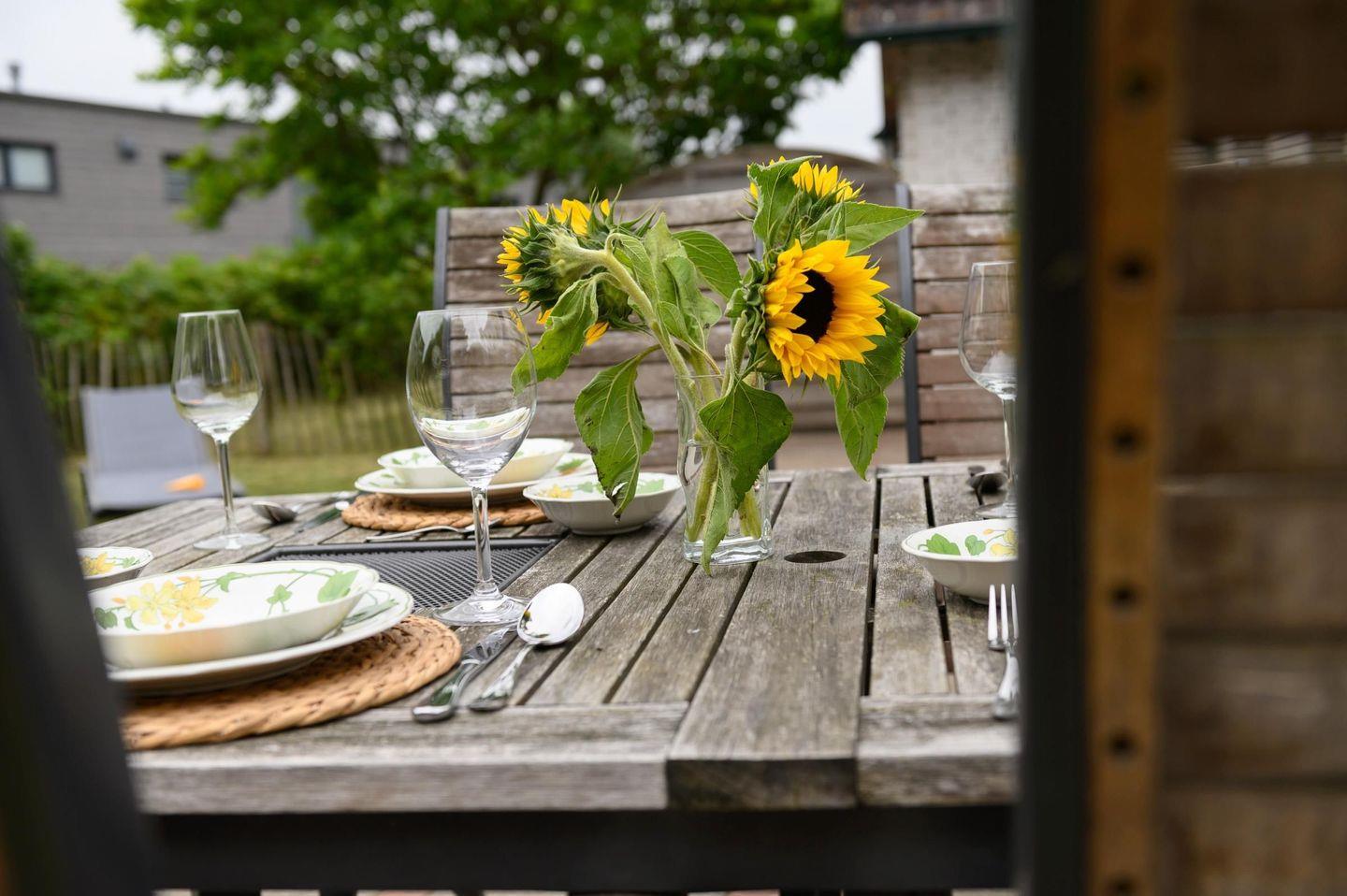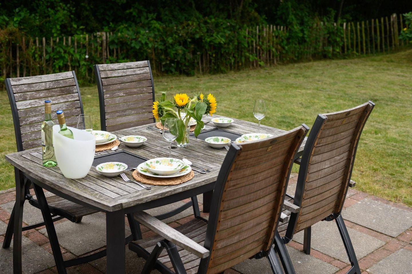 Sonnige Terrasse mit hochwertigen Holzmöbeln – ideal für Frühstück im Freien oder einen entspannten Grillabend