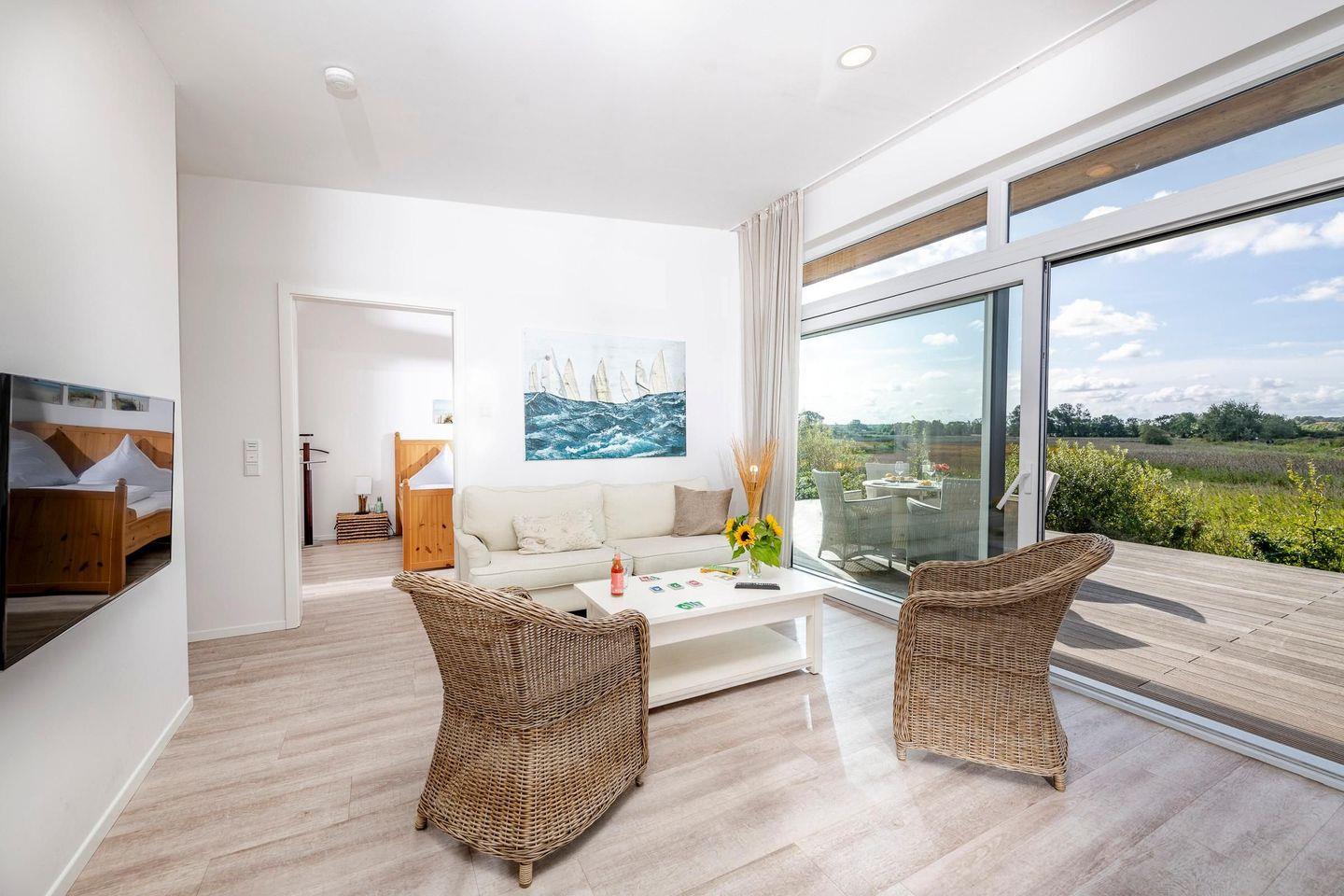 Mitten im idyllischen Landschaftsschutzgebiet der Geltinger Bucht und nur 50 Meter von der Ostsee entfernt, präsentiert sich das Ferienhaus Insel als architektonisches Highlight. Einen halben Meter über dem Erdboden schwebend, fügt sich das barrierefreie Haus harmonisch in die natürliche Umgebung ein und bietet Platz für 2 bis 4 Personen.