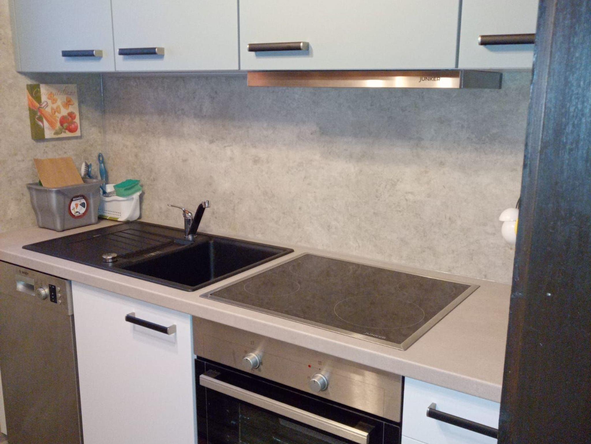 Die Küche ist u.a. mit einem Geschirrspüler, Kühlschrank mit kleiner Gefrierkombination, moderner Elektroherd mit Backofen, Mikrowelle, Toaster, Kaffeemaschine, Handmixer, Wasserkocher und weiteren Küchenutensilien ausgestattet.