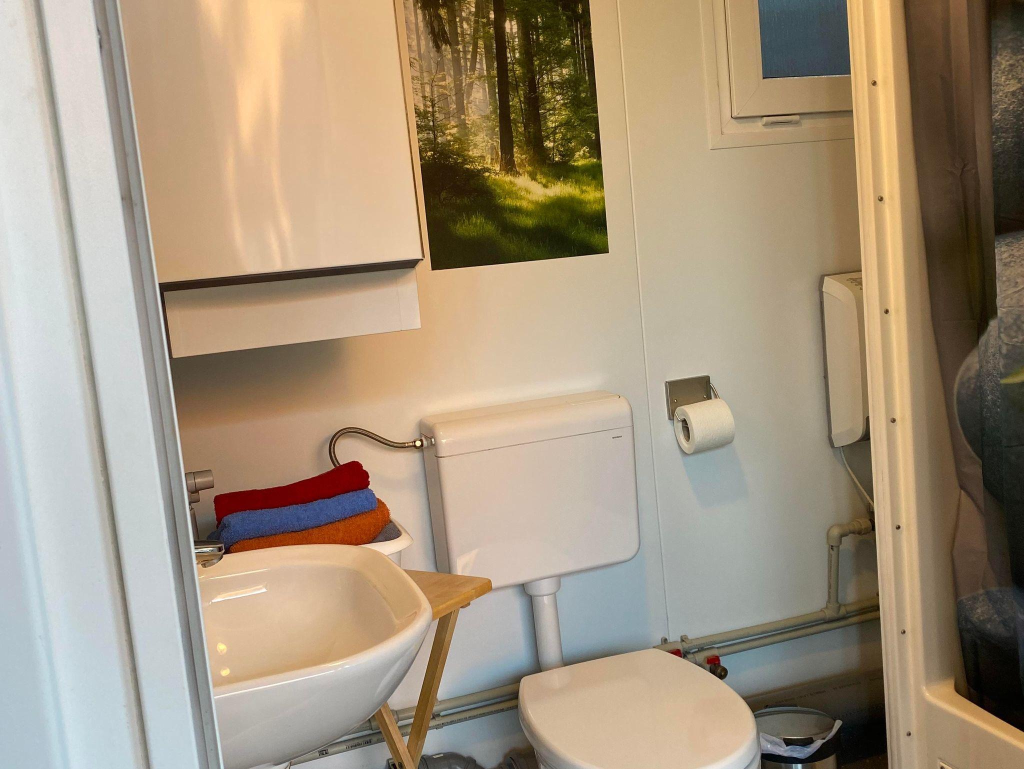 Im Eingangsbereich des Campingfasses gibt es Sitzgelegenheiten sowie einen ausziehbaren Tisch. Kochmöglichkeiten sind im Fass nicht vorahnden, dafür aber eine kleine Pantryküche mit Spüle, Kühlschrank, Kaffeemaschine, Wasserkocher und Geschirr. Umgeben von einem grünen Blätterdach und mit einem duftenden Kaffee in der Hand, können Sie den Tag auf der Terrasse Ihres Campingfasses begrüßen. WLAN ist vorhanden. In das Schlaffass eingebaut ist eine Musikanlage, mit der Sie Ihr Handy über Bluetooth verbinden können. Ein Bad mit WC und Dusche finden Sie in einem kleinen Sanitärhäusschen nur wenige Meter vom Schlaffass entfernt, das Ihnen zu Ihrer alleinigen Nutzung zur Verfügung steht. Bettwäsche und Handtücher sind vorhanden.