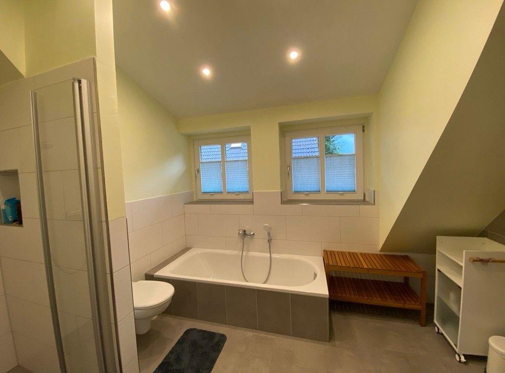 Ein besonderes Highlight dieser Unterkunft ist das großzügige Badezimmer im Obergeschoß, das sowohl mit einer Dusche als auch mit einer Badewanne ausgestattet ist. Der bodengleiche Duschbereich ermöglicht einen komfortablen Zugang, während ein Haartrockner und ein großes Waschbecken ebenfalls zur Verfügung stehen. Ein zusätzliches Gäste-WC unten sorgt dafür, dass auch bei mehreren Gästen ausreichend Privatsphäre gewährleistet ist.