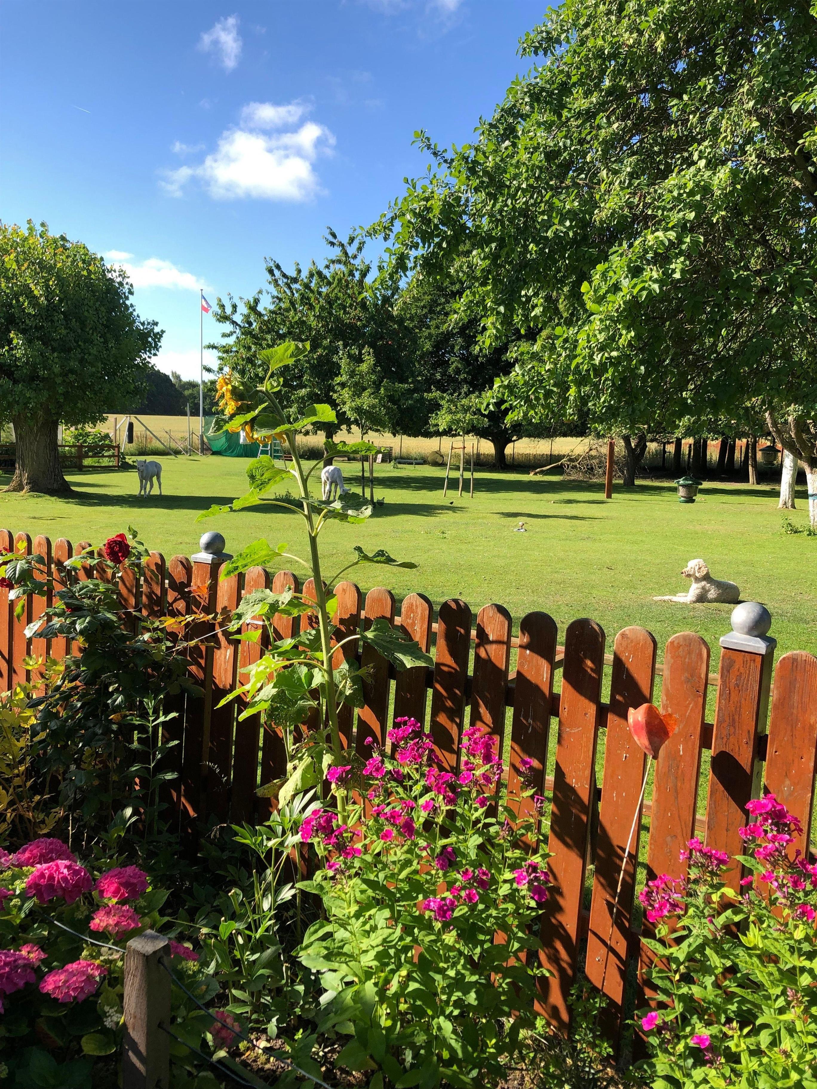 Die Ferienwohnung befindet sich auf unserem Hof, auf dem wir als Familie auch leben. Dennoch sind unser Privatbereich, als auch der Bereich für unsere Feriengäste, komplett voneinander getrennt. Daher wir die Privatsphäre aller gewahrt. Unserer Hof ist komplett eingezäunt, so dass sich alle, vor allem die Kinder, frei bewegen können. Auch sind alle Tiere räumlich von unseren Gästen getrennt, denn mit uns wohnen unsere Riesenschnauzerhündin Ebby und unsere zwei Alpaka Horst und Fridolin. In unserem großzügigen Garten haben unsere Gäste eine Außenterasse mit Grill und Gartenmöbeln und und sollte es einmal regnen lädt unser "Grillhaus", als überdachte Außenmöglichkeit, zum Verweilen ein. Auch ein Spielplatz mit Trampolin, Rutsche, Schaukel und Sandkiste befindet sich auf unserem Hof.