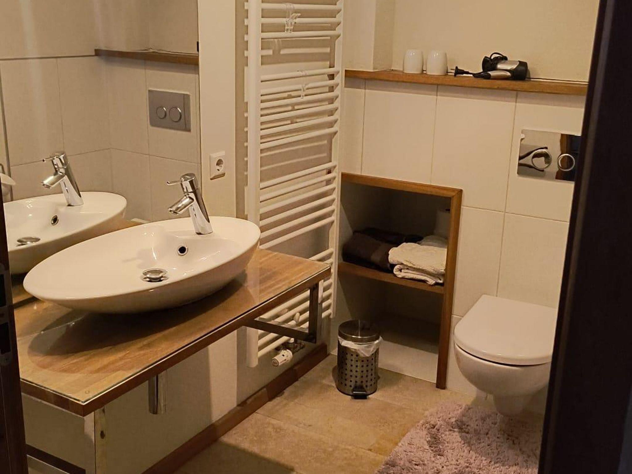 Separate Küche, sonniger Essplatz, großzügiges Wohn-/Schlafzimmer mit bequemem Doppelbett, modernes Bad mit großer Dusche und WC. Waschbare Kissen und Bettdecken in Übergröße, allergikergeeignet, WLAN