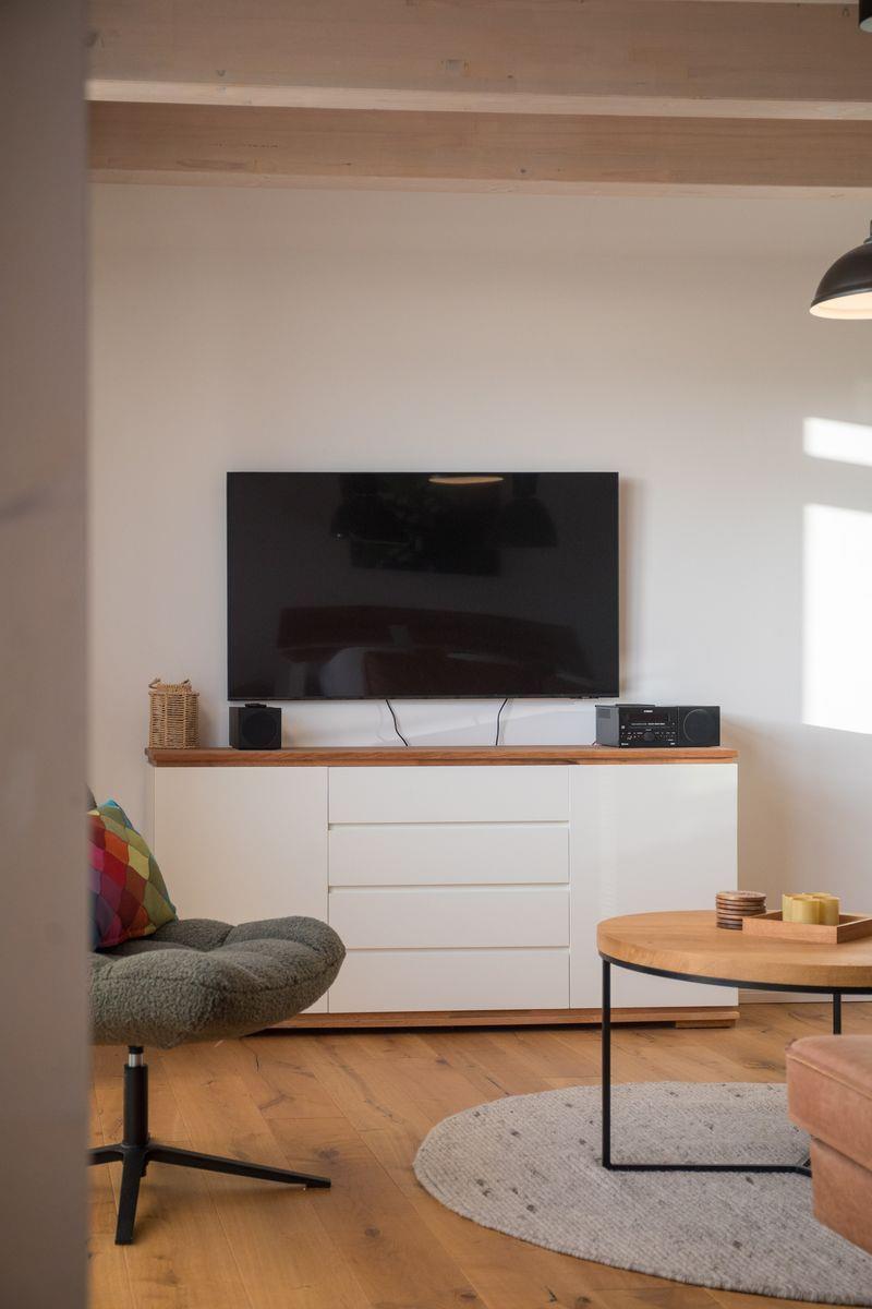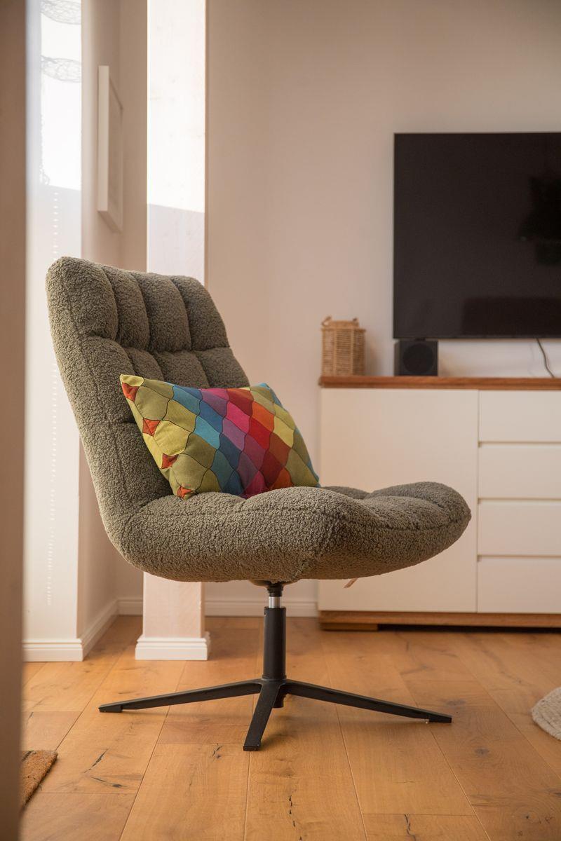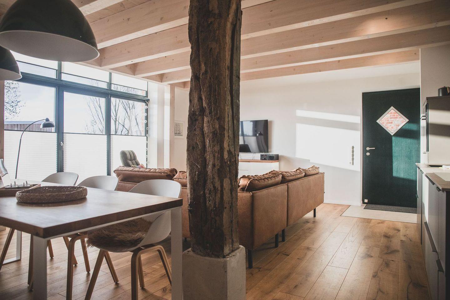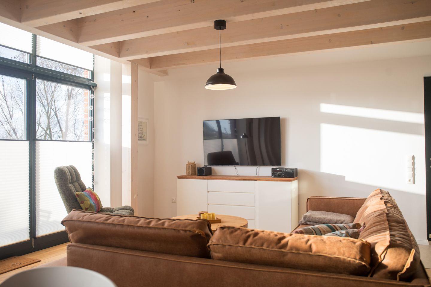 Der Wohnbereich ist offen und einladend gestaltet. Eine Sofaecke mit Sofa, Sesseln und TV lädt zu entspannten Abenden ein. Digitaler Satelliten-TV in einer Größe von 55 Zoll, sowie WLAN mit einer Internetgeschwindigkeit ab 100 Mbit/s bieten gute Voraussetzungen für Unterhaltung und komfortables Arbeiten oder Streamen. Bücher stehen ebenfalls bereit.