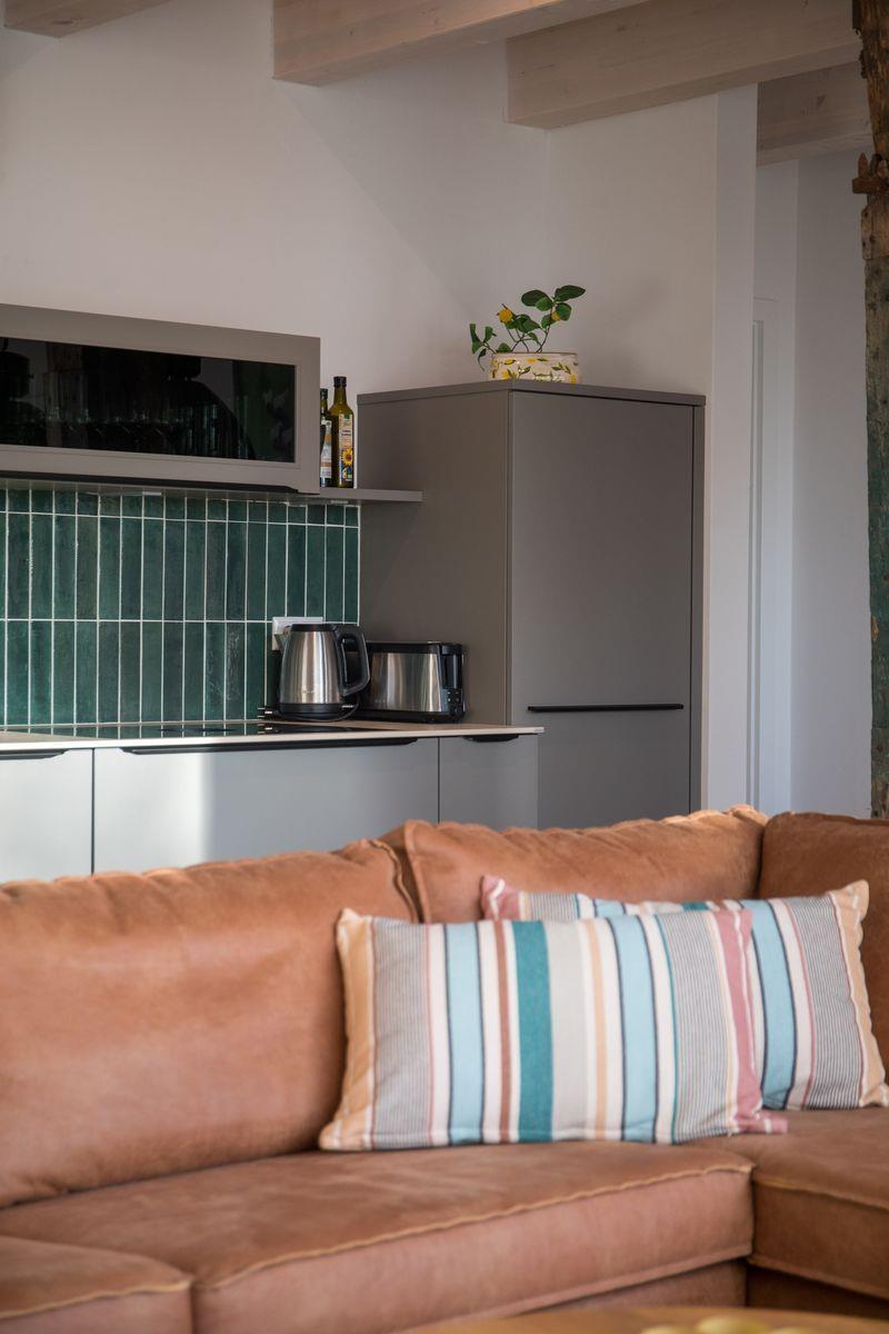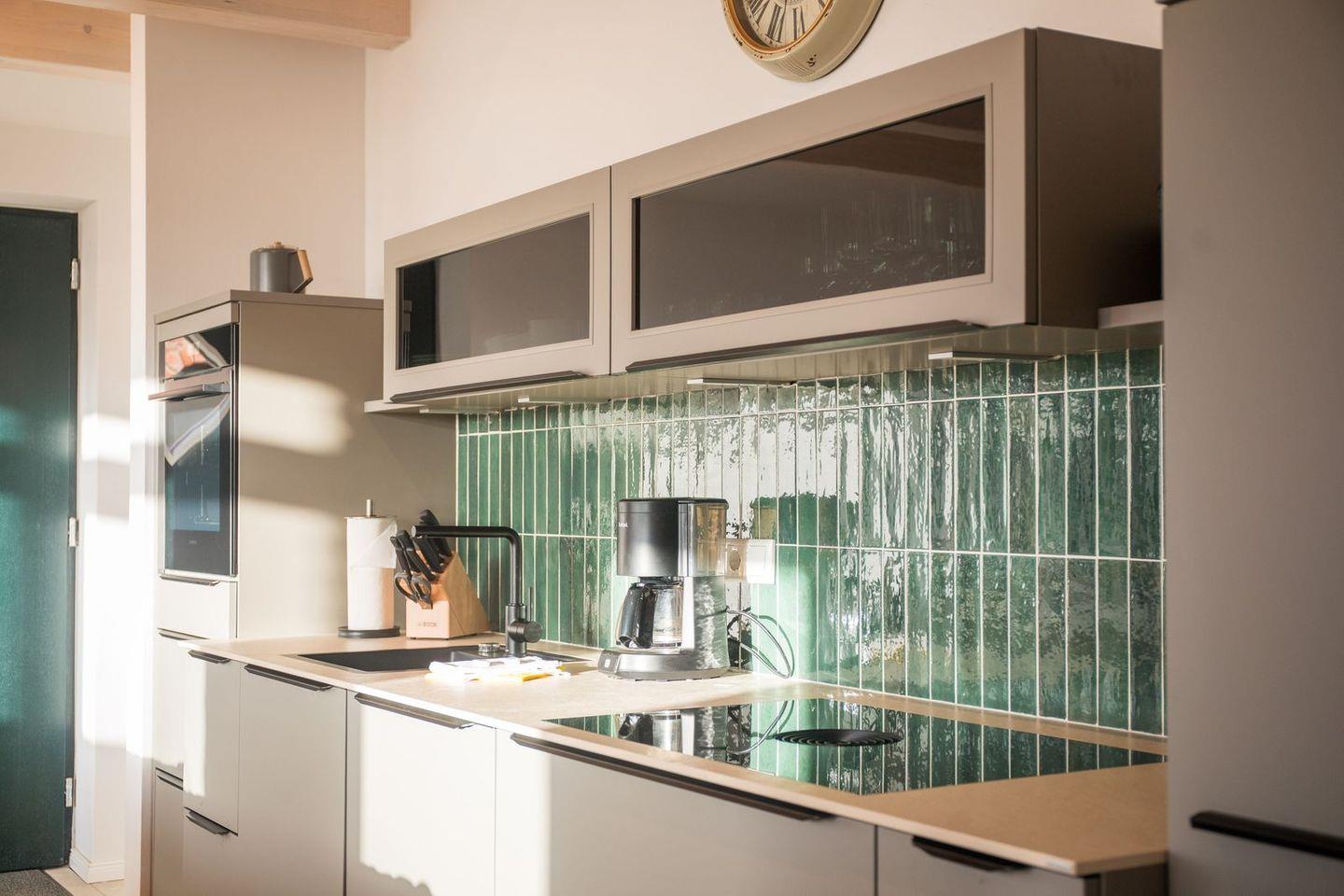 Die offene Küche zum Wohnzimmer ist funktional ausgestattet und verfügt unter anderem über Induktionsherd, Backofen, Spülmaschine, Kühlschrank mit Gefrierfach, Kaffeemaschine, Wasserkocher, Toaster sowie Küchenutensilien, Geschirr und Besteck. Ein Essbereich mit Esstisch bietet ausreichend Platz für gemeinsame Mahlzeiten/Zeit.
