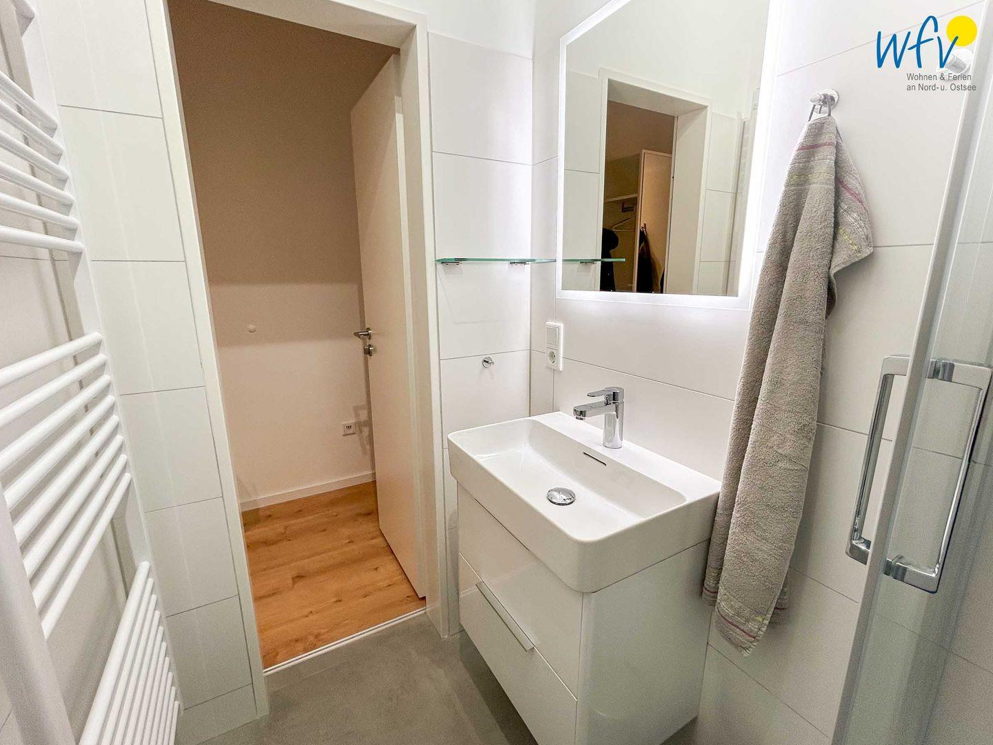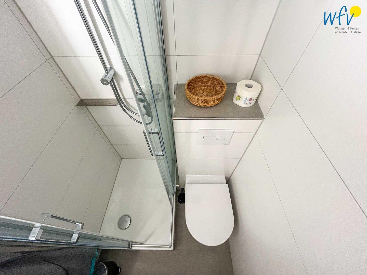 Nach einem Tag an der frischen Nordseeluft können Sie im eleganten Badezimmer in Ruhe abschalten und eine erfrischende Dusche genießen. Es verfügt zudem über Waschbecken, WC, einem beleuchteten und beheizbaren Spiegel und bietet Ihnen ausreichend Ablage- und Verstaumöglichkeiten für Ihre Bad- und Kosmetikutensilien.