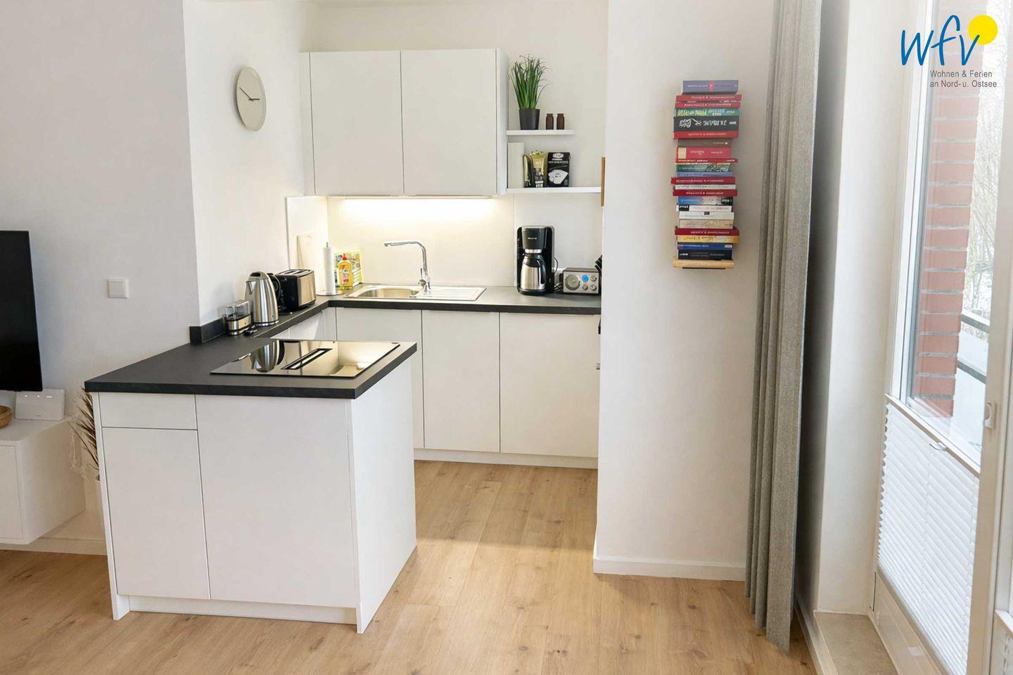 In der modernen offenen Küche lassen sich bequem kleine Snacks für den Ausflug oder leckere Mahlzeiten zubereiten. Ausgestattet ist die Küche u.a. mit einem 4-Zonen-Induktionskochfeld mit integriertem Dunstabzug, einem Geschirrspüler und einem Kühlschrank sowie mit diversen Kleingeräten (Kaffeemaschine, Wasserkocher, Toaster etc.).