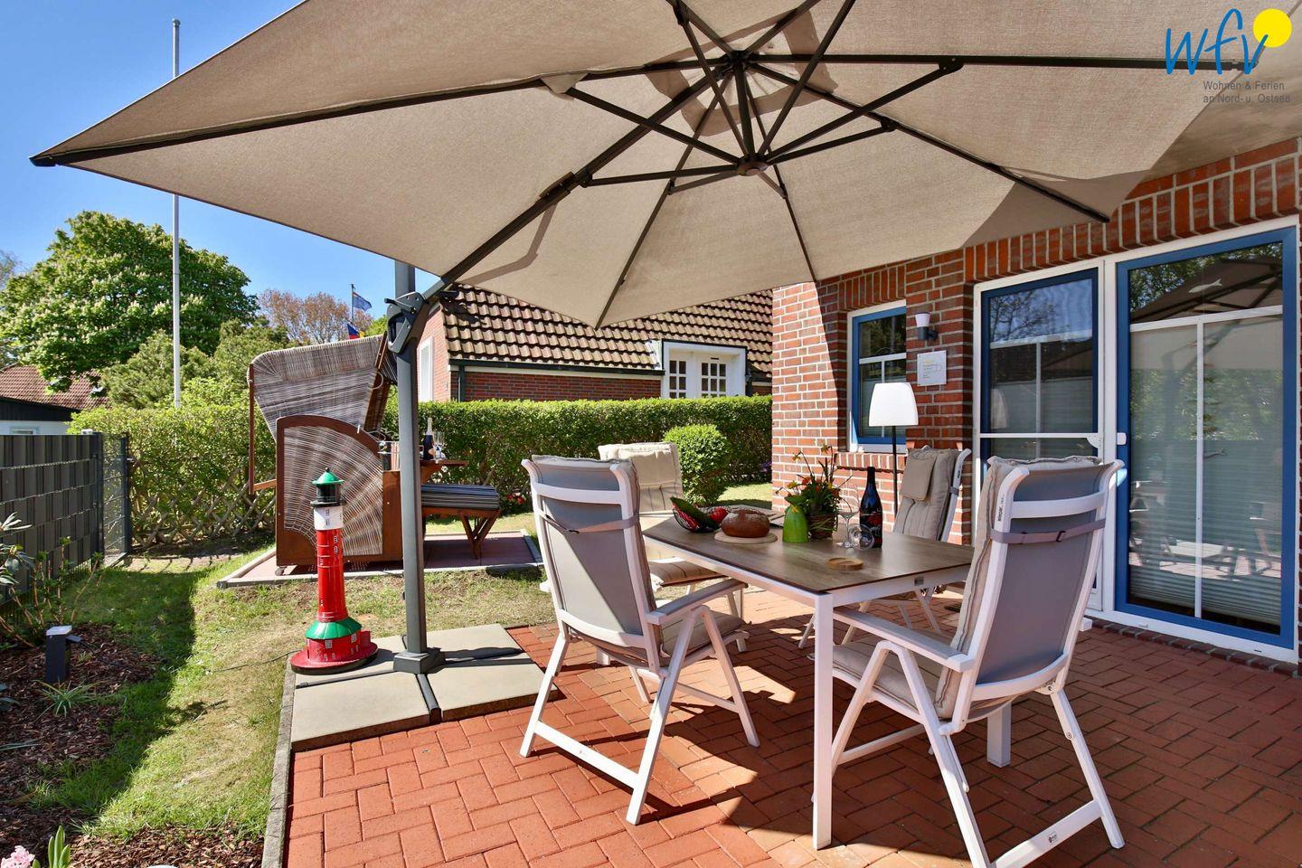 Die hübsch möblierte Südterrasse verwöhnt Sie mit sonnigen Erholungsmomenten! Von morgens bis abends sind Ihnen hier traumhafte Stunden an der frischen Nordseeluft garantiert. Es wartet bereits ein gemütlicher Strandkorb und ein Grill auf Sie!