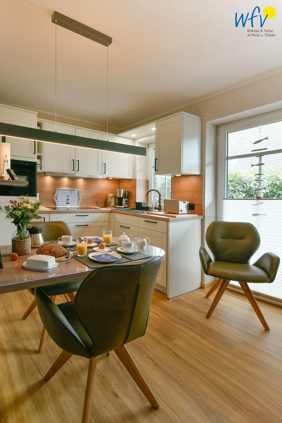 Für die bequeme Selbstverpflegung in Ihrem Urlaub auf Wangerooge verfügt die Ferienwohnung über eine hochwertig moderne Einbauküche - u.a. mit Induktionsherd/Backofen mit integrierter Mikrowelle, Kühlschrank mit Gefrierfach, Geschirrspüler sowie Kaffeemaschine, Wasserkocher und Toaster. Ein kleiner Essplatz mit schönem Blick auf die sonnige Südterrasse mit Garten (Doppelflügeltüre) gehört ebenfalls zur Einrichtung.