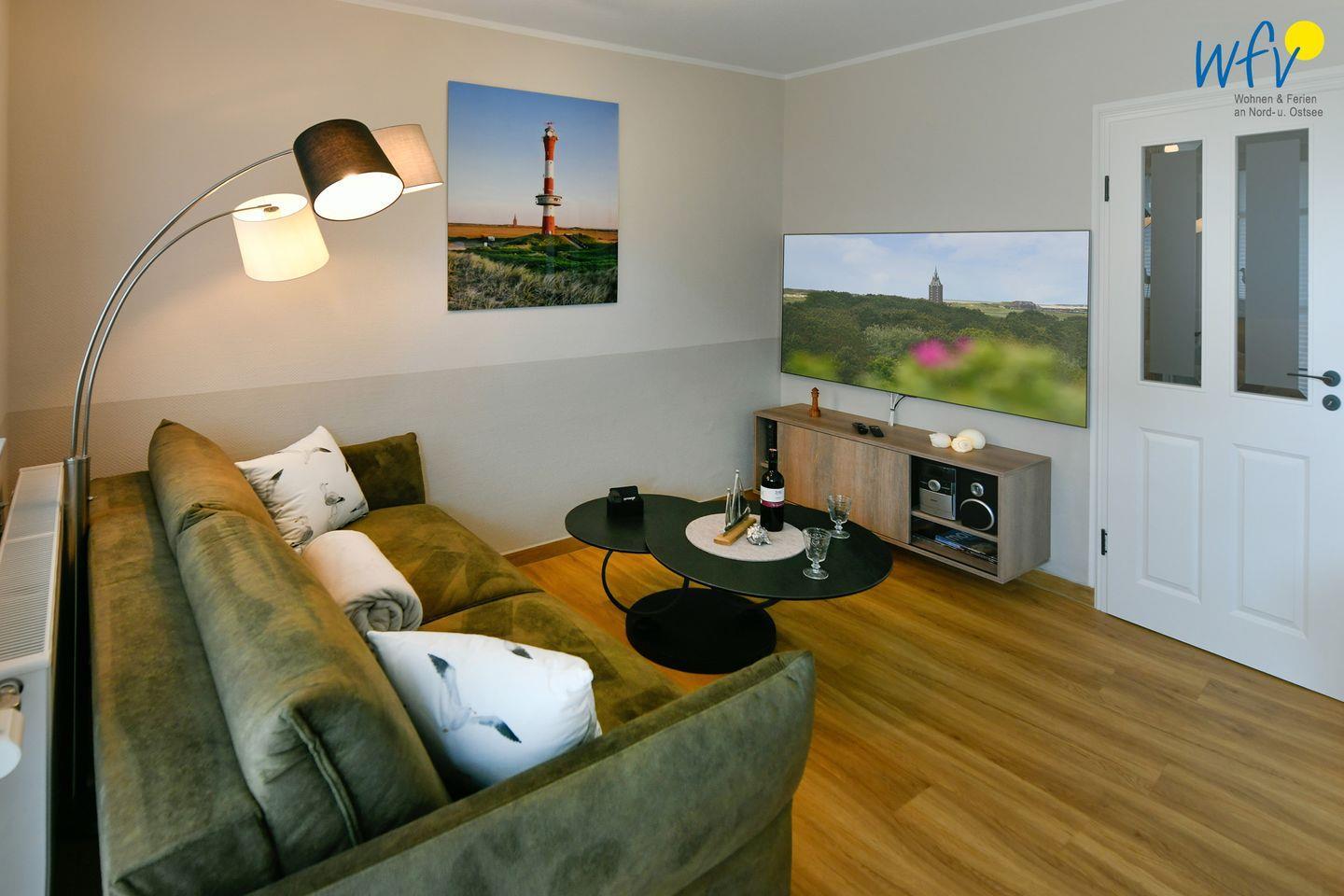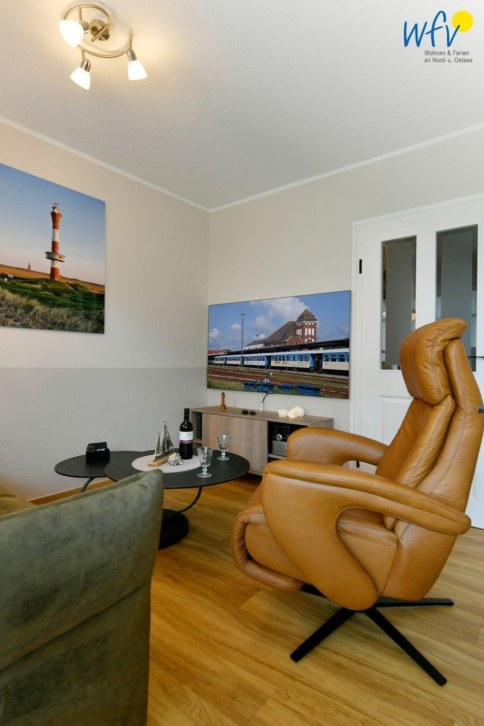 Nach dem Strandtag oder der Fahrradtour lädt die gemütliche Couchecke mit Relaxsessel und OLED-Flachbildfernseher zum ausgiebigen Entspannen ein. Ein wunderbarer Platz zum Fernsehen, Musik hören und Ausruhen! Zum Surfen vom Smartphone aus empfangen Sie freies WLAN ohne weitere Kosten.