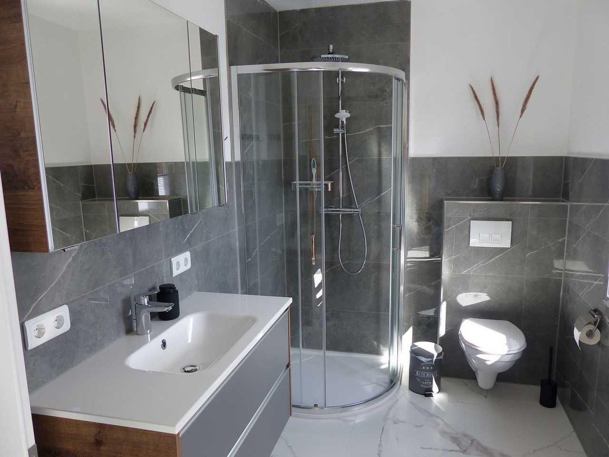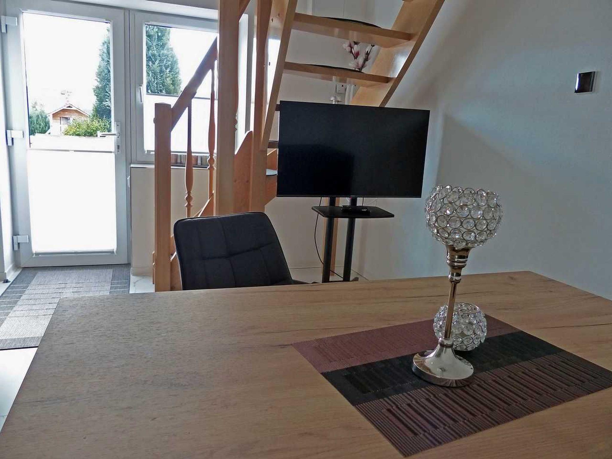 Von der Terrasse betreten Sie die Wohnküche der Ferienwohnung mit der Eckbank. Die Küchenzeile ist mit Spülmaschine, Herd, Ceran-Kochfeld sowie einer Mikrowelle ausgestattet. Ebenso im Erdgeschoss befindet sich das Duschbad mit WC. Im Obergeschoss sind 2 Schlafzimmer: eins mit 2 Einzelbetten und eins mit einem Doppelbett. In jedem Schlafzimmer stehen je 1 Kommode und 1 Kleiderschrank. Die Ferienwohnung erstreckt sich über 2 Etagen. 1 Wohnküche mit Küchenzeile und 1 Bad mit Dusche/WC befinden sich im Erdgeschoss sowie 1 Schlafzimmer mit 2 Einzelbetten und 1 Schlafzimmer mit 1 Doppelbett im Obergeschoss.