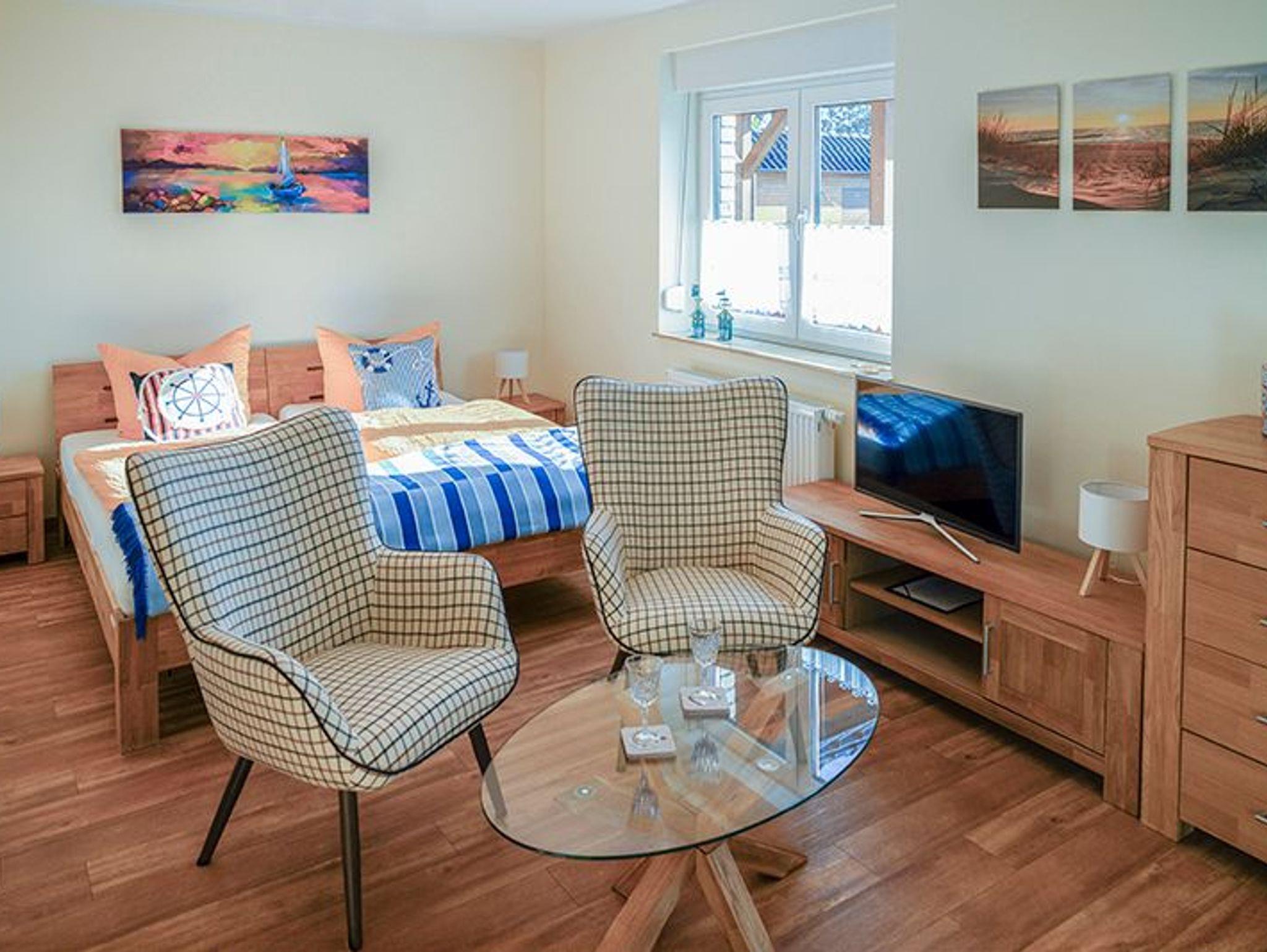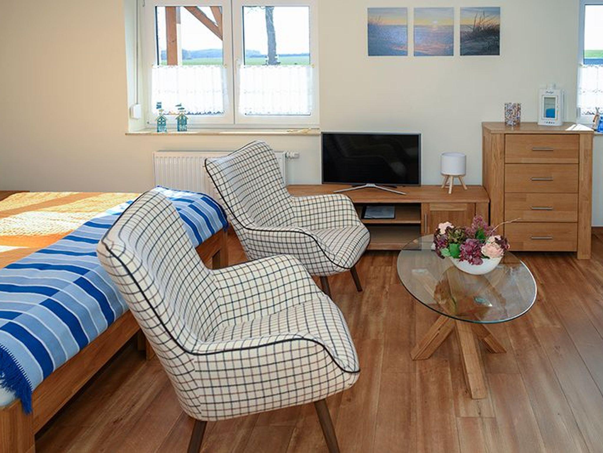 Gemütliches, helles und modern eingerichtetes Nichtraucher-1-Raum-Appartment mit kombiniertem Wohn-/Schlafbereich, Küchenzeile, Dusche/WC, Diele und Abstellkammer im Landhaus Rügeband für 2 Erwachsene und max. 1 Kind unter 3 Jahren. Von dieser Unterkunft gelangen Sie direkt auf die möblierte Terrasse und in den Garten mit Grill-/Spielplatz und Sitz-/Ruhebereichen. Alle Fenster der Unterkunft verfügen über Außenjalousien. Frühstücksservice kann nach Absprache und Verfügbarkeit beim Gastgeber direkt angefragt werden.