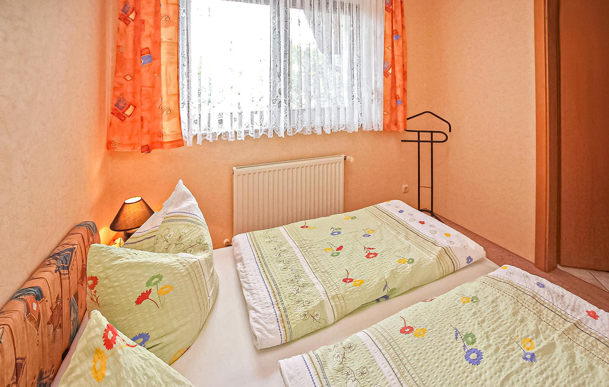 De to ferielejligheder ligger hver for sig i ejerens hus på den velholdte villaejendom i udkanten af byen (Eldenholz). Grundet sit job er ejeren sjældent til stede. Badestrand, restauranter og indkøbsmuligheder findes inden for 1 km. Denne lejlighed ligger i stueetagen. Separat adgang. Faciliteter med: Stue (polstrede møbler, TV, radio/CD), soveværelse (dobbeltseng), køkken (elkomfur med ovn, køleskab, mikroovn, spiseplads, diverse køkkenmaskiner), bad/WC, centralvarme. Hver lejlighed har et møbleret udendørs opholdsområde, grill, liggestole, cykelstativer og parkeringsplads. Den samlede pris inkluderer sengelinned, håndklæder, energi- og vandforbrug samt slutrengøring. Betales på stedet: turistskat. Den statsgodkendte Waren spa ligger direkte ved Müritz i charmerende omgivelser. Det er også turistcentret i Mecklenburg Lake District. Attraktioner omfatter den historiske gamle bydel, havnen med passagerskibsfart, den tilstødende promenade og talrige spisemuligheder samt Müritzeum, et naturoplevelsescenter med et enormt ferskvandsakvarium og udstillinger om de særlige kendetegn ved Mecklenburgs sødistrikt. Der er også udendørs swimmingpools, båd- og cykeludlejning, surf- og sejlerskoler og mange indkøbsmuligheder i byen. Waren er indgangsporten til nationalparken Müritz, som nemt kan udforskes via det veludviklede netværk af cykelstier. Motorvejsforbindelse ca 25 km.