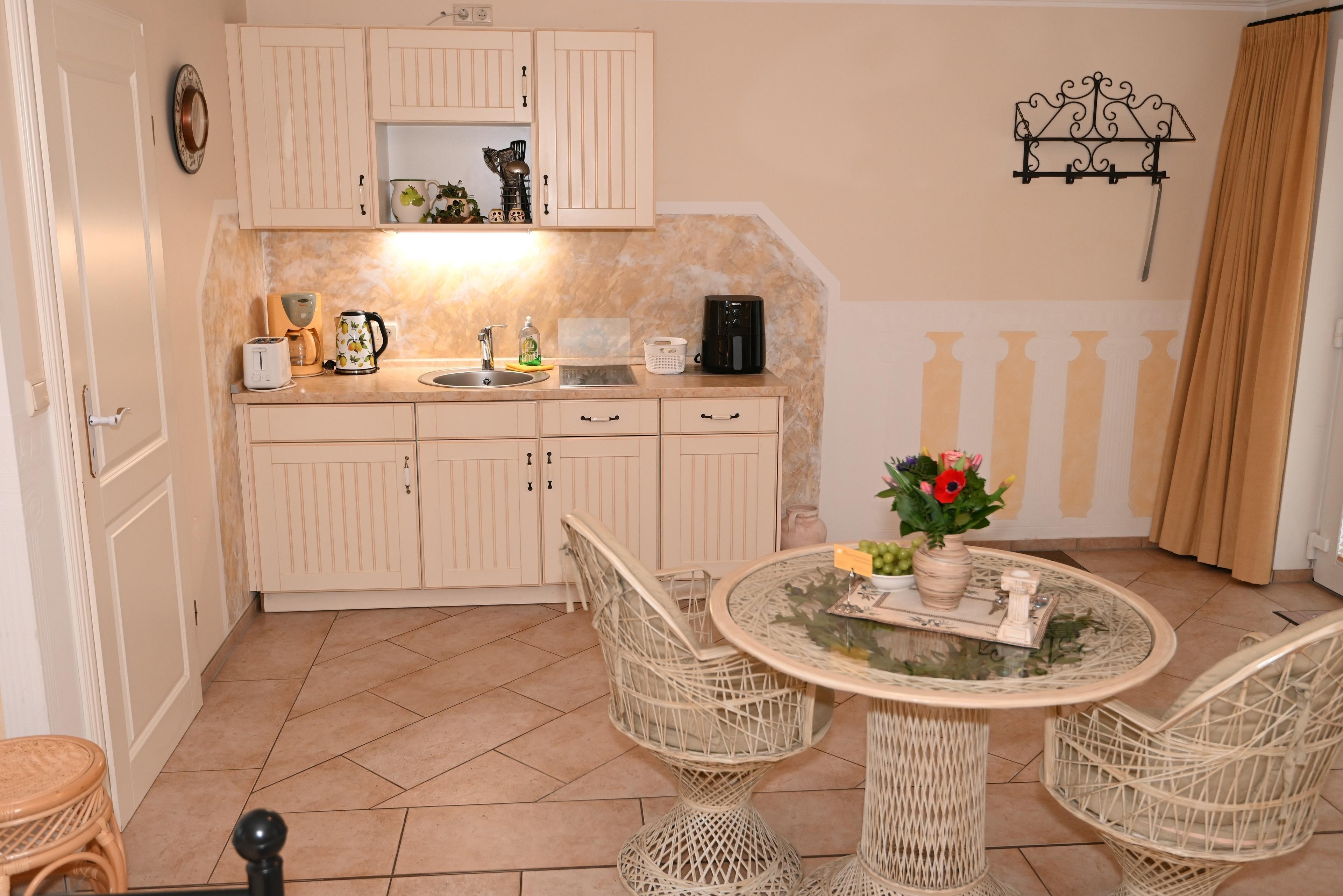 KÜCHENZEILE mit Spülmaschine, Kühlschrank inkl. Gefriermöglichkeit, 2er-Cerankochfeld, Heißluftfriteuse, Kaffeemaschine, Wasserkocher, Toaster und vielen weiteren Kochutensilien