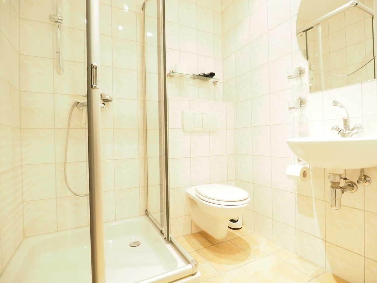 Das moderne Badezimmer ist mit einer Dusche mit tiefem Einstieg ausgestattet und rundet den durchdachten Komfort dieser Ferienwohnung perfekt ab.