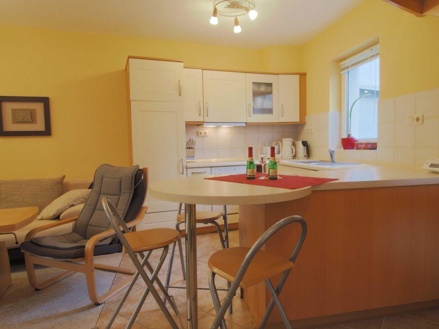Nach einem sonnigen Strandtag lädt das gemütliche Wohnzimmer mit Schlafcouch zum Entspannen ein. Die offene, voll ausgestattete Wohnküche mit Tresen bietet alles, um gemeinsam zu kochen, zu genießen und den Abend gemütlich ausklingen zu lassen.