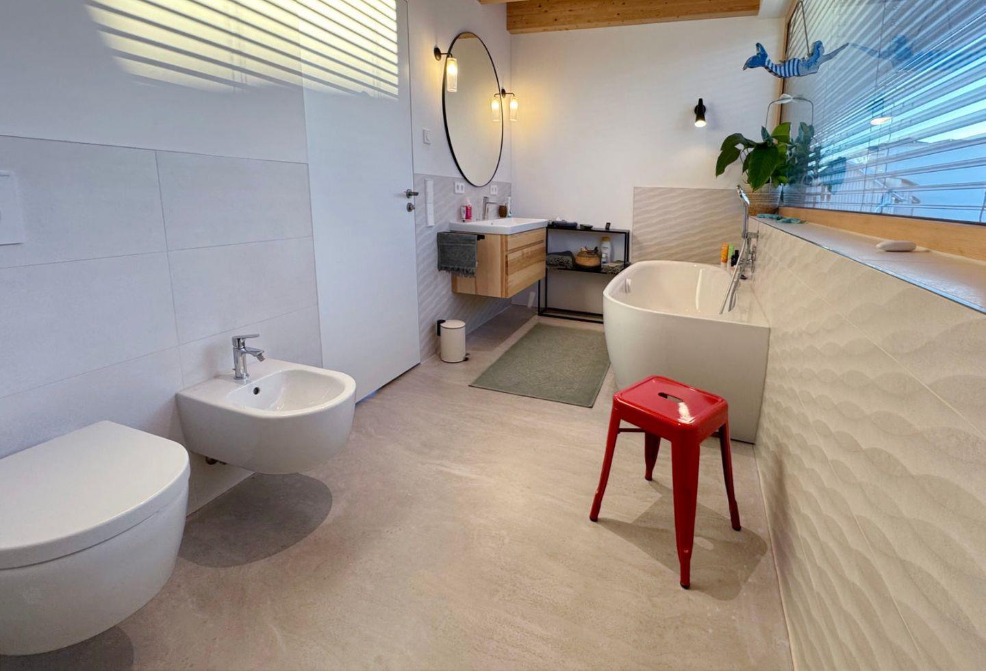 Lehmputzwände in den Schlafzimmern, für ein besonders angenehmes Raumklima; Wärmepumpe, Fußbodenheizung und Photovoltaikanlage