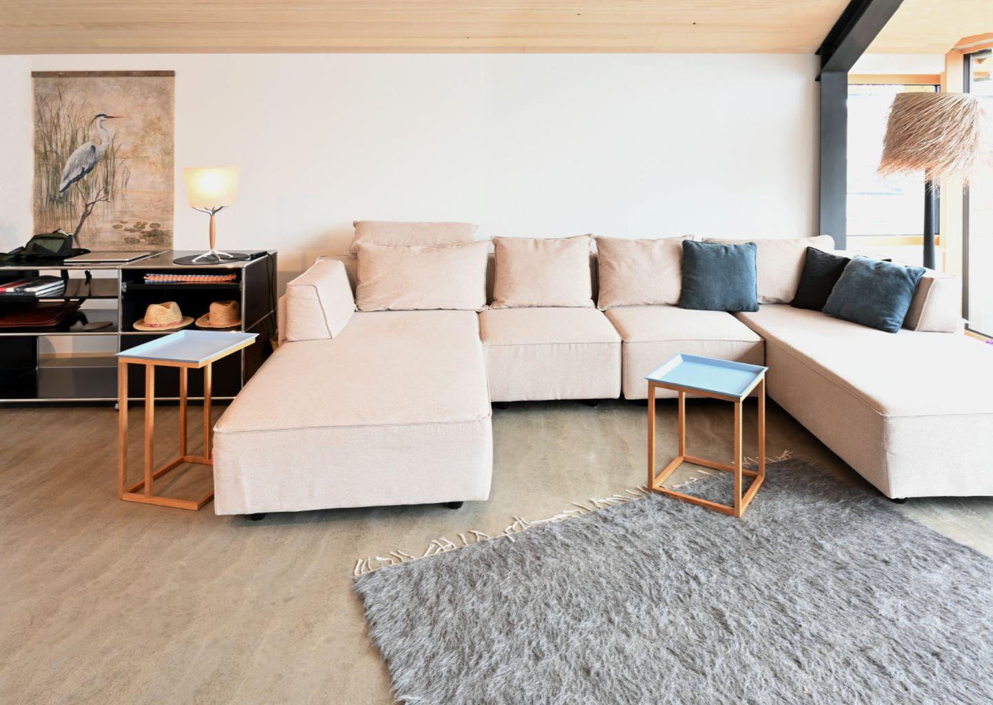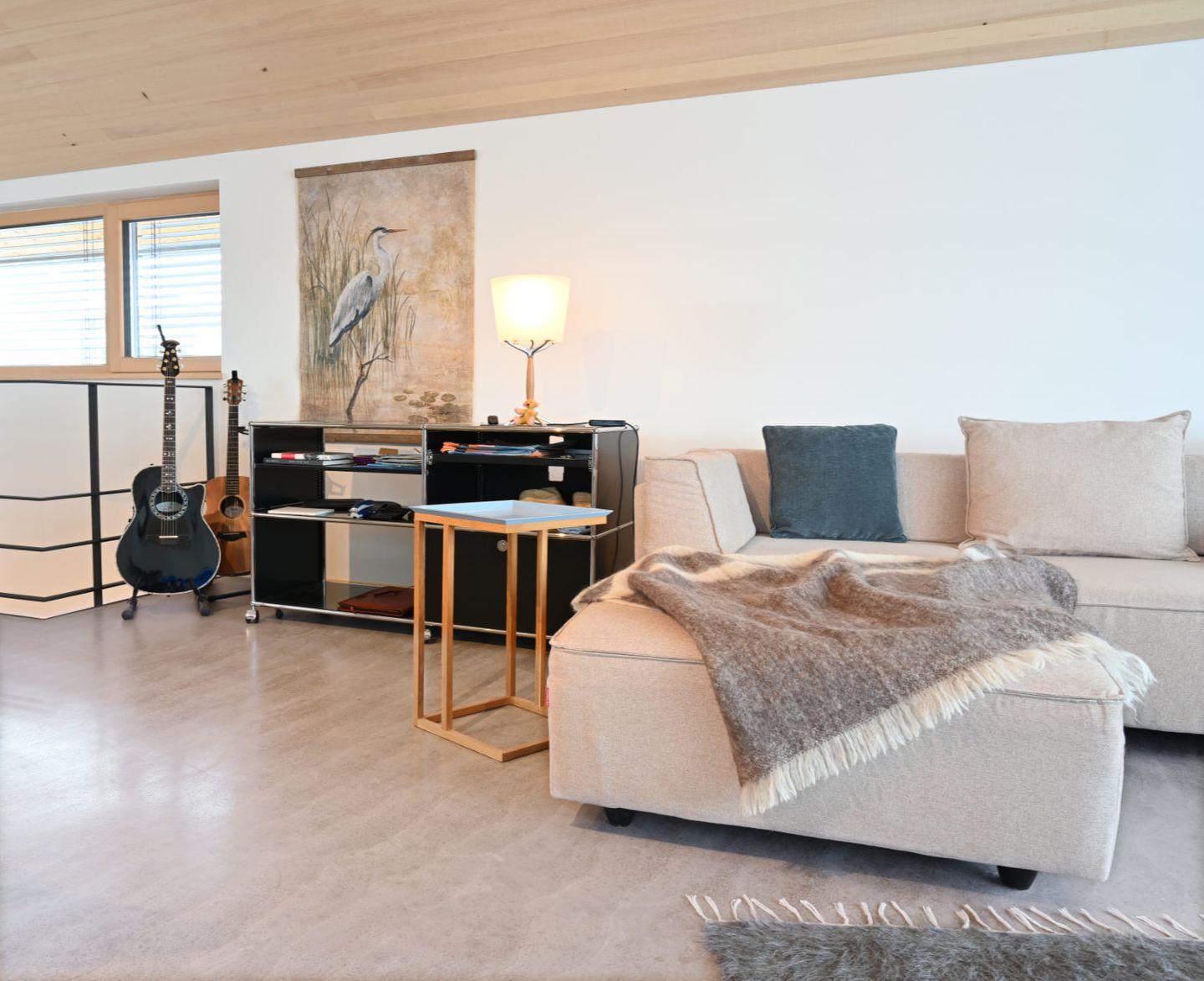 Das Dachgeschoss ist das Herzstück der Wohnung: Ein offener Wohn-, Ess- und Kochbereich mit Sicht auf den Bodensee aus fast jedem Winkel des Raums. Der offene Dachstuhl mit einer Holzverkleidung aus Weißtanne ist angelehnt an die ganz im Trend liegenden Wellnesshotels in den Alpen. Der Fußboden (auf beiden Etagen) aus glatt geschliffenem und dann geöltem Beton, hat die Optik von Sand unter dem Wasser des Sees. Ein sehr angenehmes Gefühl unter den Füßen.