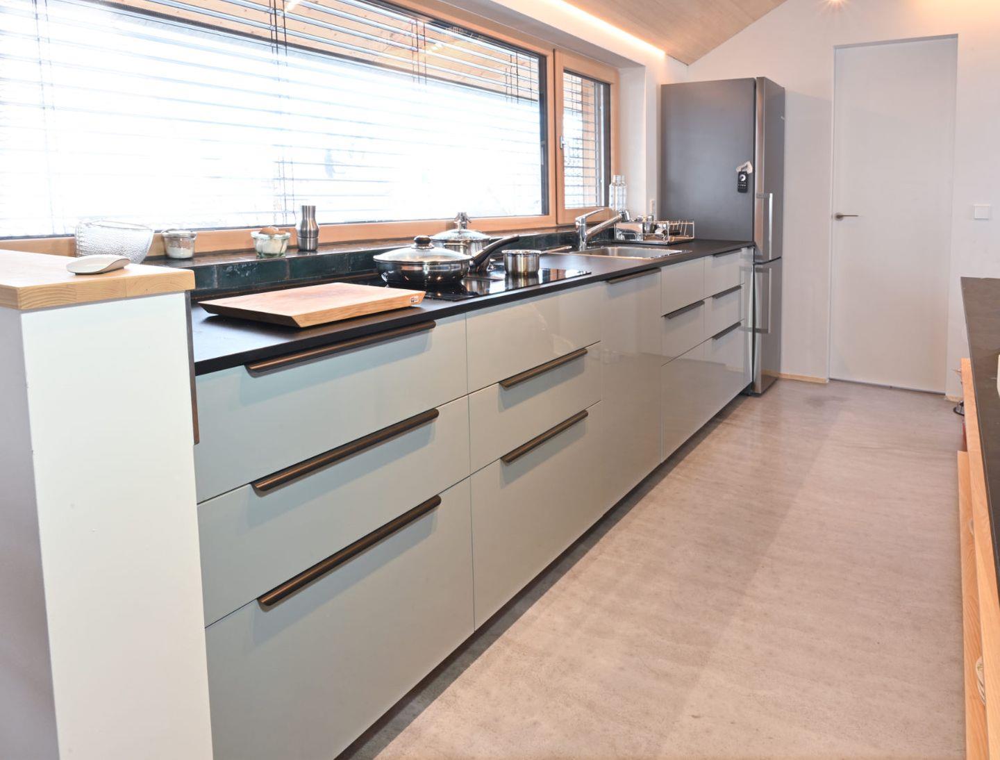 Die moderne, voll ausgestattete Küche, öffnet sich zum Wohnraum der mit großem Esstisch, großzügiger Sofalandschaft und einem Fernseher ausgestattet ist. Die zum Bodensee gerichtete Giebelseite ist komplett verglast. Zwei sechs Meter lange Fenster über der Küchenzeile und über der Treppe schaffen zusätzlich einen einzigartigen Rundblick und sorgen für viel angenehmes Tageslicht.