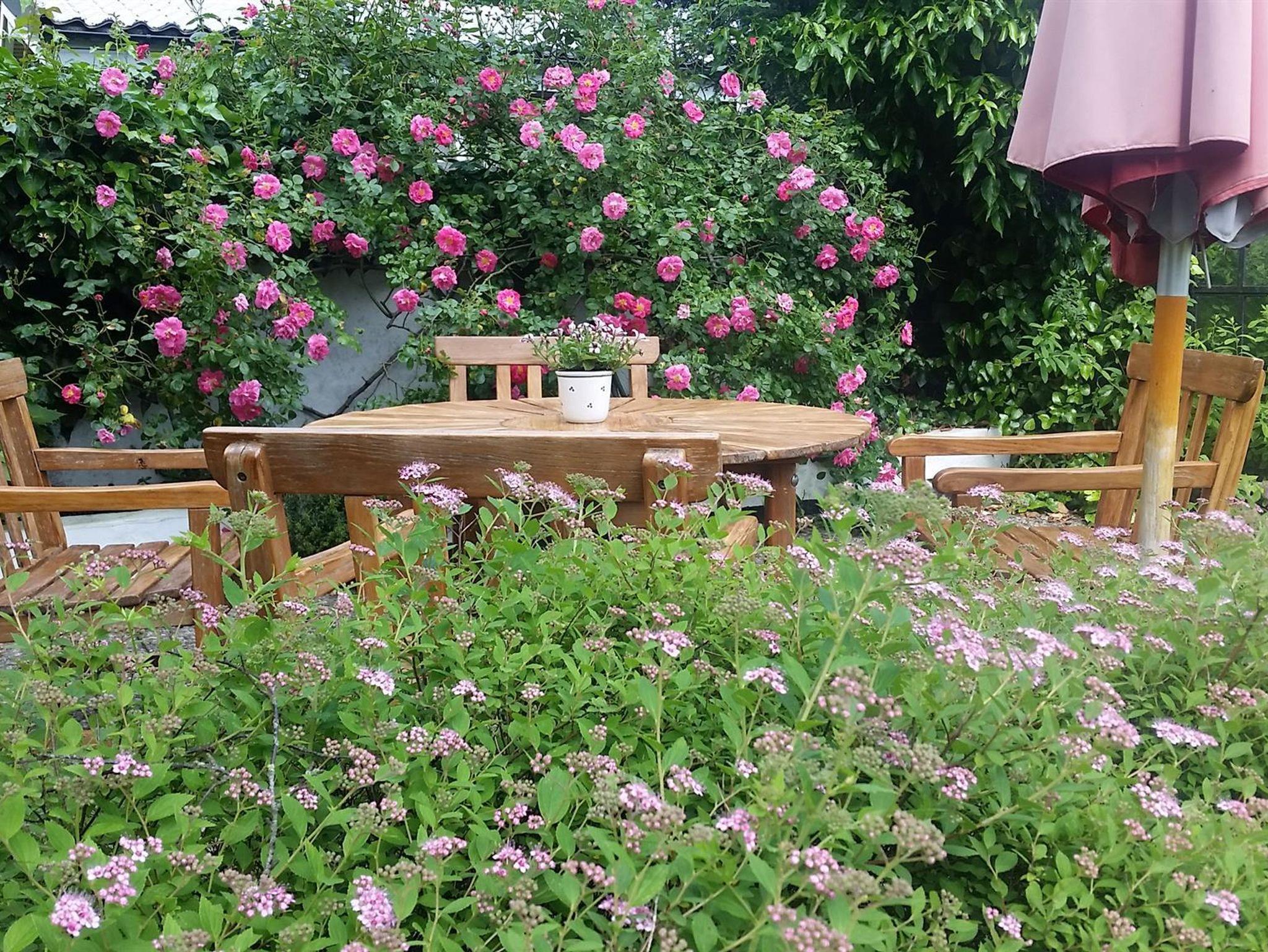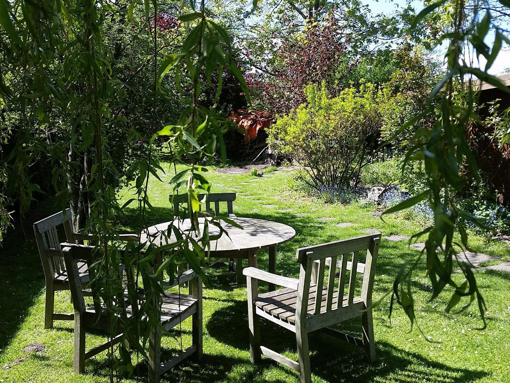 • 1 Terrasse mit Tisch und Stühlen und Blick in den großen Garten