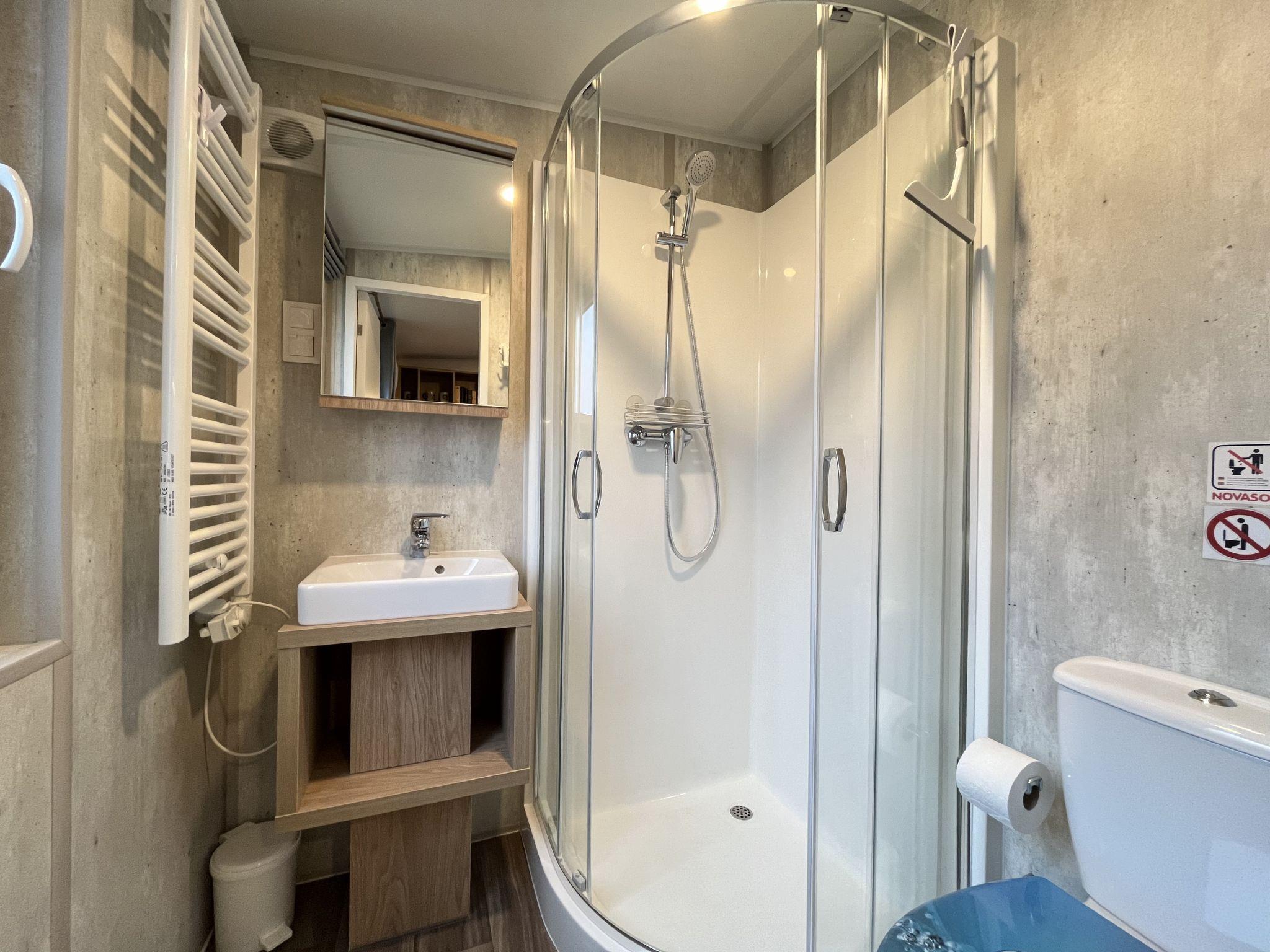 "Tiny Haus Karin", 2-room mobile home 25 m2. Object suitable for 2 adults + 2 children. Cosy furnishings: living/sleeping room with 1 double sofabed, dining table and satellite TV (flat screen). Exit to the terrace. 1 room with 1 french bed (140 cm, length 200 cm). Kitchenette (oven, 2 induction hot plates, toaster, kettle, electric coffee machine). Shower/WC. Electric heating, air-conditioning. Terrace. Terrace furniture. Facilities: Internet (WiFi, free). Parking (1 car) at 10 m. Please note: non-smokers only. ATTENTION: The Wi-Fi connection may be limited depending on capacity.