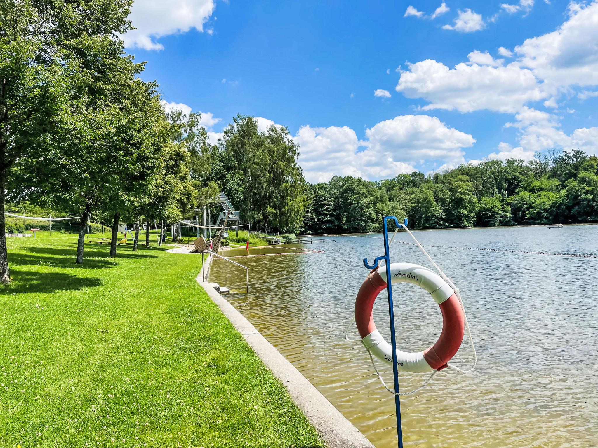 Resort "Campingpark Wemding". 50 houses in the resort. Outside the resort, 2 km from the centre of Wemding, 50 m from the lake. For shared use: slide, outdoor shower, beach volleyball, children's playground, bathing place. In the complex: WiFi, kiosk. 400 m long motor access to the house. Central parking spaces. Supermarket 2 km, restaurant 2 km, bus stop "Johannisgraben-Wemding" 2.2 km, railway station "Nördlingen" 20 km, thermal baths "Treuchtlingen" 21 km. Tennis 1 km, minigolf 50 m, riding stable 1 km, ice rink 500 m. Nearby attractions: Nördlingen / Rieskrater-Museum 19 km, Dinkelsbühl 43 km, Legoland Günzburg 80 km, Playmobil-FunPark bei Nürnberg 100 km, Augsburg 70 km, München 130 km. Well-known lakes can easily be reached: Altmühlsee 35 km, Brombachsee 40 km. Please note: suitable for families. Residence with electric gates. Access to the house only possible between 7 am and 10 pm. Dogs are not allowed on the beach and sunbathing lawn. Kiosk only open from mid may to mid september.