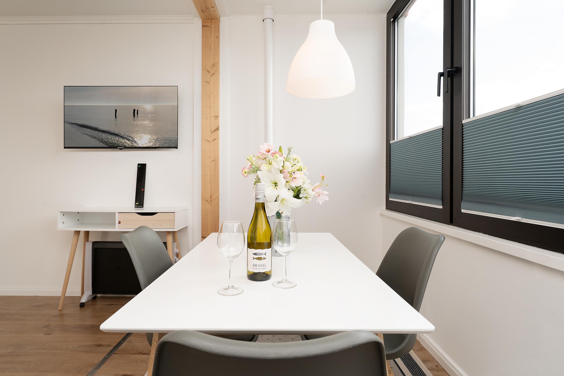 Die offene Küche ist gut ausgestattet und bietet alles, was Sie für die Zubereitung Ihrer Mahlzeiten benötigen. Zur Ausstattung gehören unter anderem ein Cerankochfeld, Kühlschrank mit Gefrierfach, Mikrowelle, Geschirrspüler, Kaffeemaschine, Wasserkocher und Toaster. Ein Essplatz lädt dazu ein, gemeinsam zu speisen und den Urlaubstag gemütlich ausklingen zu lassen.