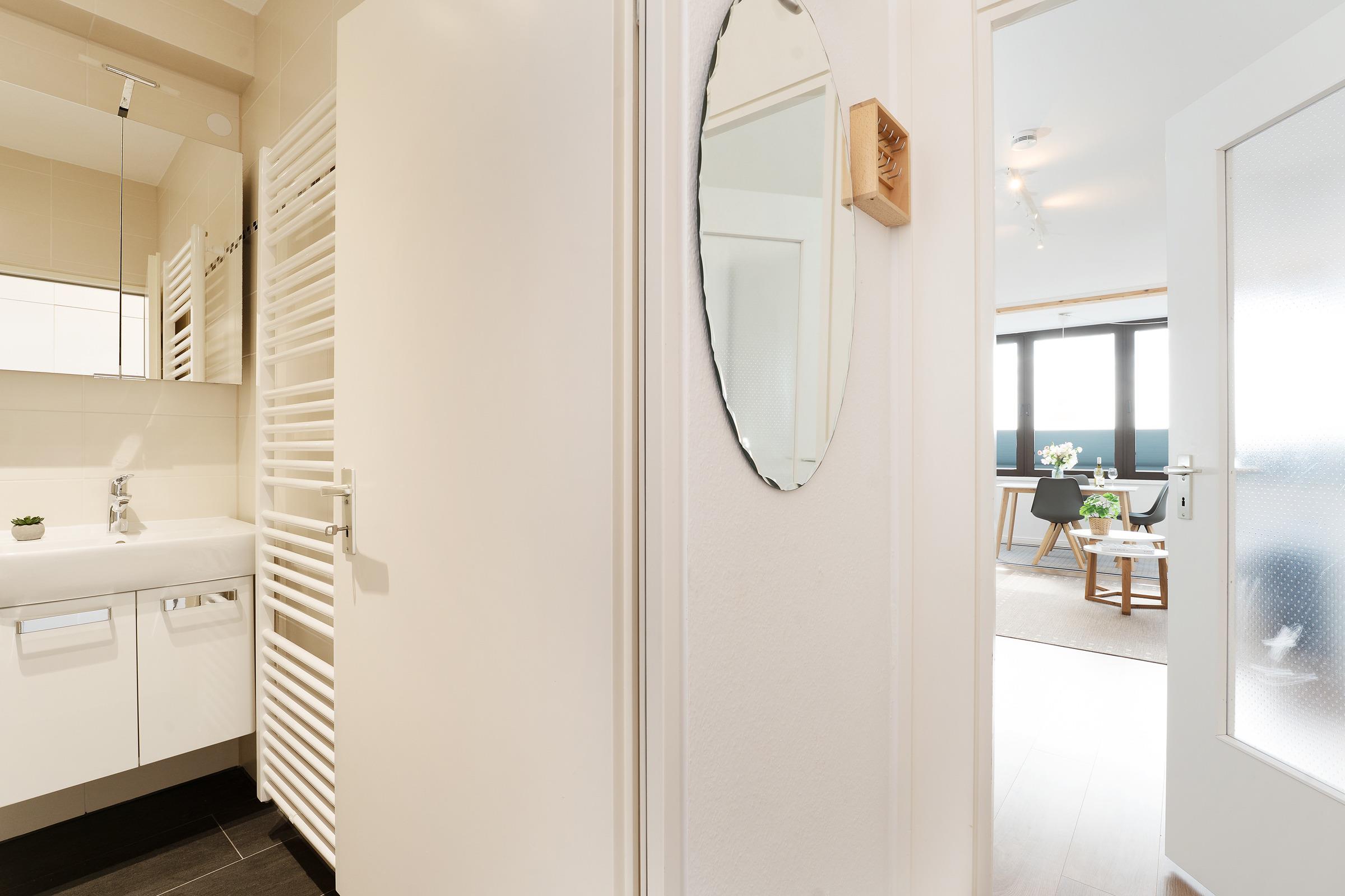 Das moderne Badezimmer verfügt über eine Dusche, ein WC sowie ein Waschbecken.