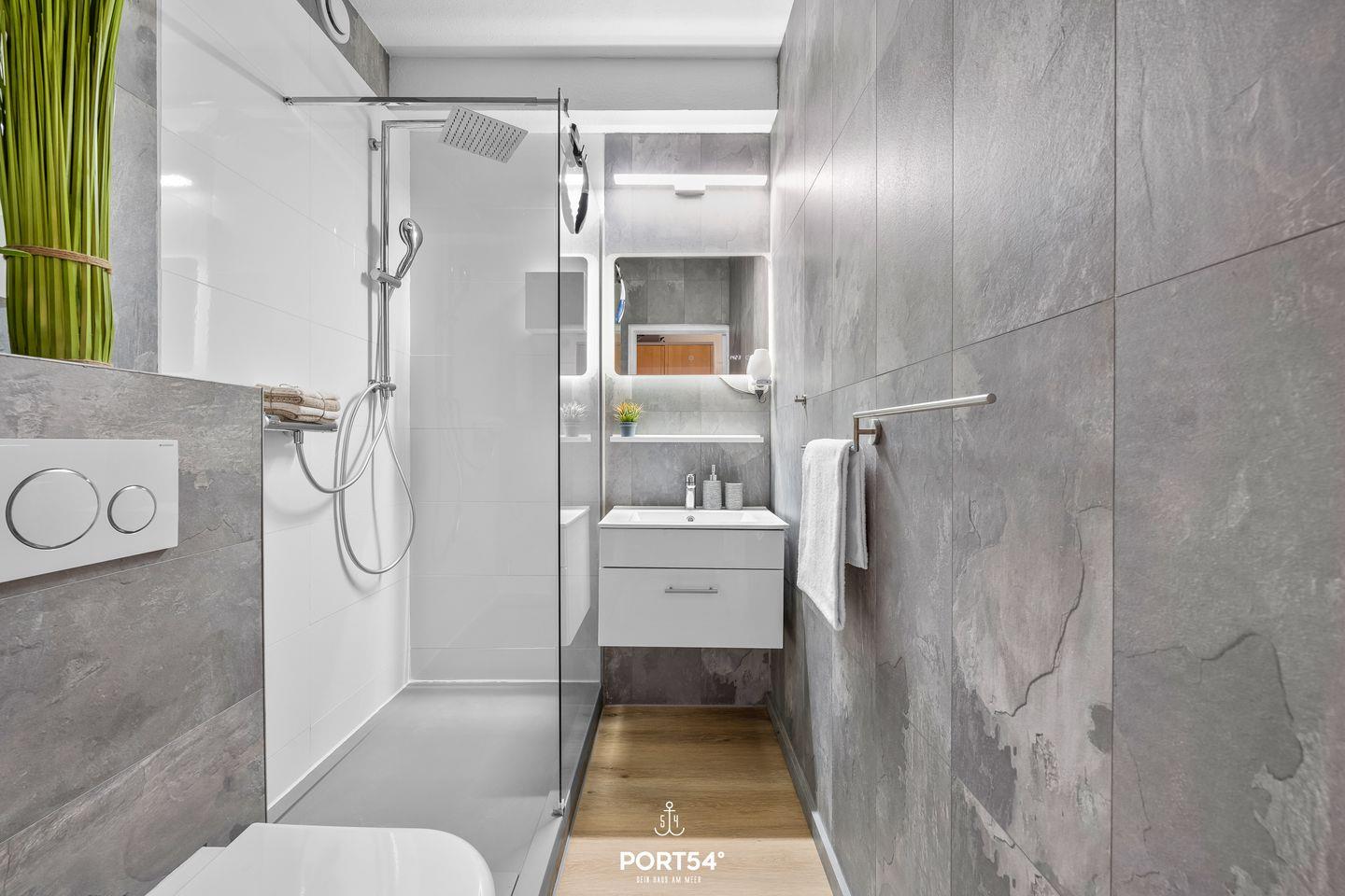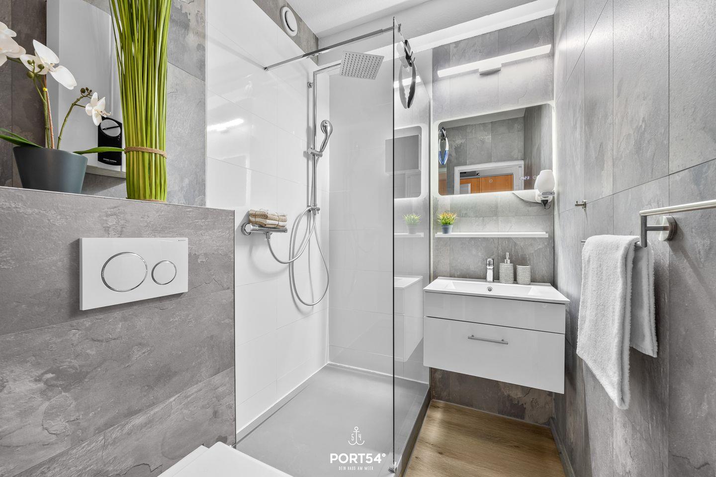 Der komfortable Wohnbereich lädt mit einer gemütlichen Sofaecke und modernen Medienmöglichkeiten – inklusive großem Smart-TV, Digitalanschluss, Radio und schnellem WLAN – zum Verweilen und Entspannen ein. Auch ein voll ausgestattetes, modernes Badezimmer mit Dusche, Waschbecken, WC, Spiegel und Haartrockner steht dir zur Verfügung. Für deinen Komfort sorgen zusätzliche Ausstattungsmerkmale wie Garderobe, Schuhschrank, Bügeleisen samt Bügelbrett, Staubsauger sowie Sicht- und Sonnenschutz an allen Fenstern.