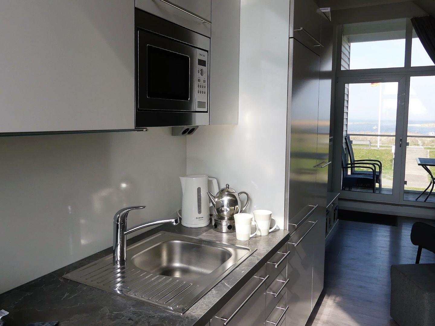 Im Außenbereich befinden sich Sitzmöglichkeiten, ein Sonnenschirm, Sonnenliegen sowie ein Holzkohlegrill. Ebenfalls befindet am Haus ein kostenfreier PKW Stellplatz. Ob laue Sommerabende, stürmische Herbstnachmittage oder kühle Wintertage: diese Doppelhaushälfte besticht mit seiner Ausstattung sowie einer naturnahen Umgebung zu jeder Jahreszeit. Vom Balkon aus genießen Sie den Blick Richtung Meer.