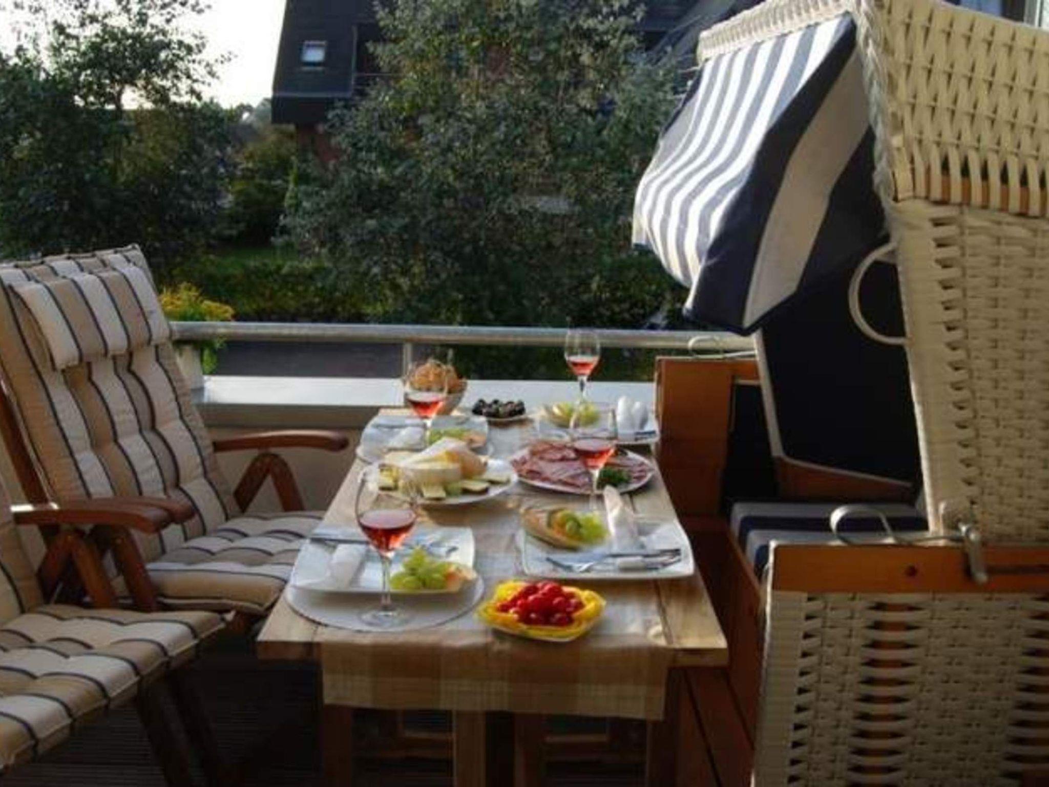 Sonniger Südwestbalkon: mit Strandkorb, Stühlen und einem Tisch. Im Flur befinden sich eine Garderobe sowie ein Schuhschrank.
