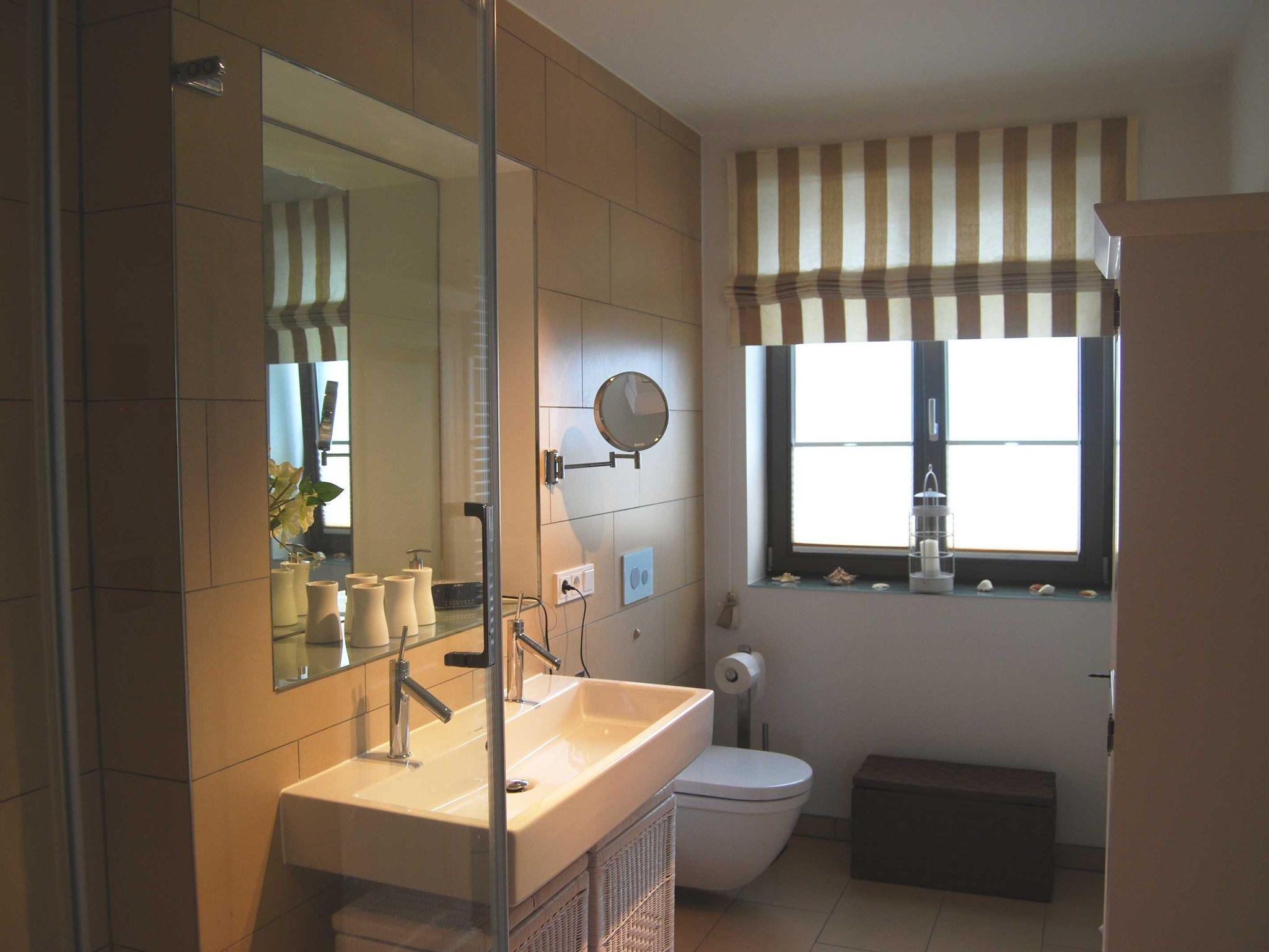 Designerbad: mit großer Dusche, Doppelwasch-becken und Einbauspiegel.