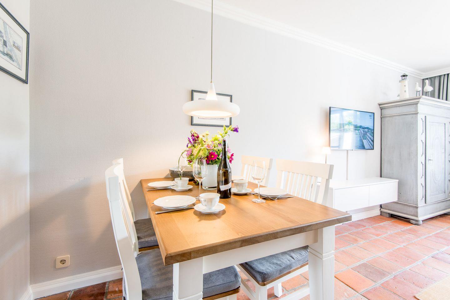 Wohn-/Koch-/Essbereich: Gut ausgestattete Landhausküchenzeile mit angrenzendem Essenbereich mit Platz für bis zu 4 Personen. Der gemütliche Wohnbereich lädt mit TV, Sofaecke und Sessel zum Verweilen ein. Vom Wohnbereich haben Sie Zutritt auf die möblierte Südterrasse mit eigenem Strandkorb.