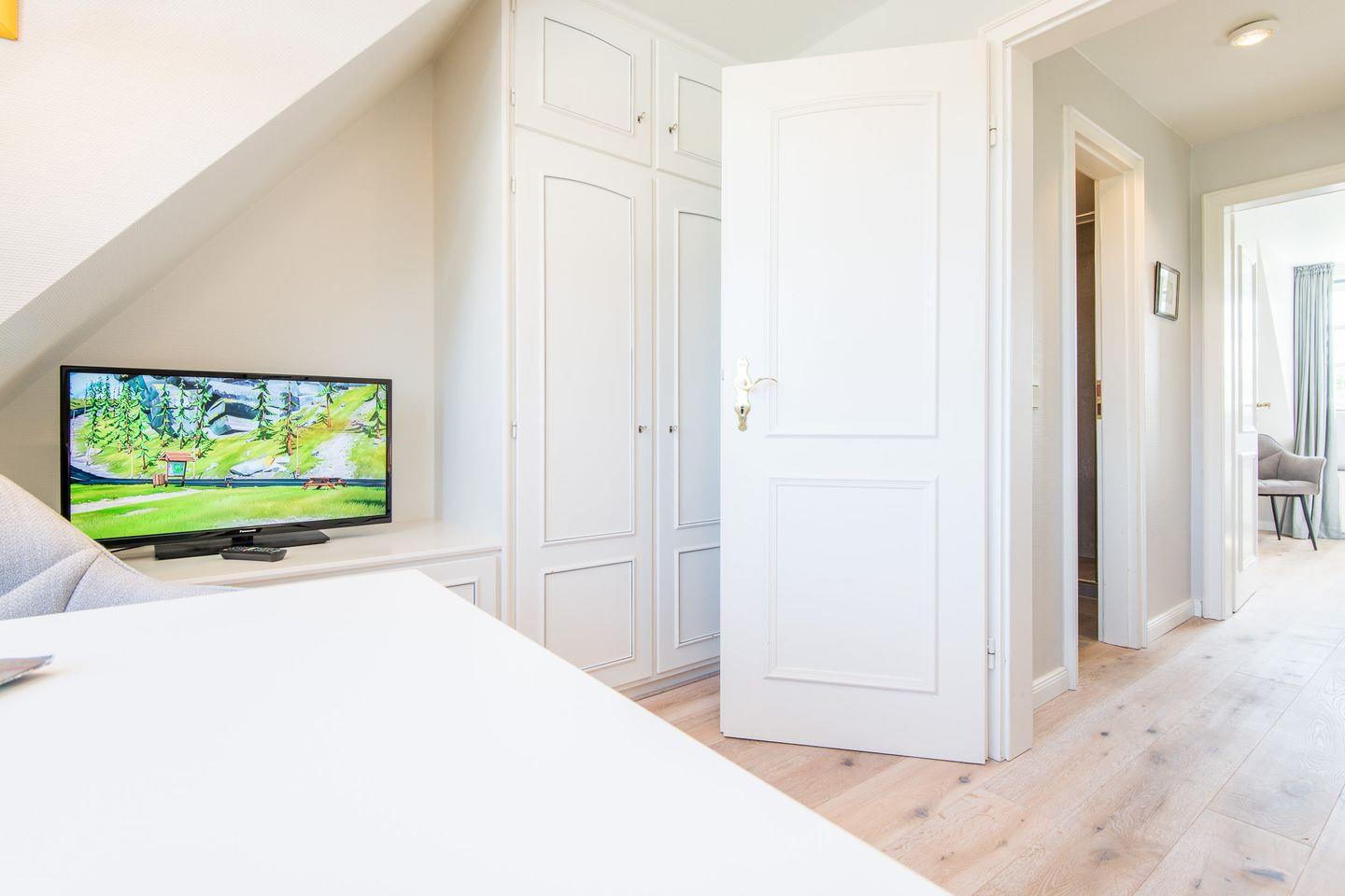 Schlafzimmer 2: Helles Einbettzimmer mit Einbauschrank und TV. Das Einzelbett lässt sich in wenigen Minuten für eine weitere Person vergrößern.