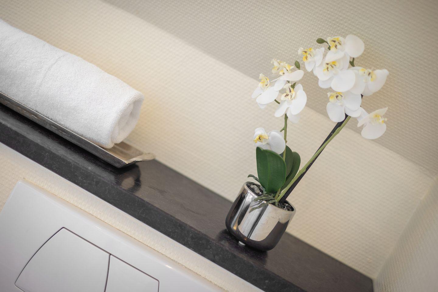 Das Schlafzimmer mit Doppelbett (180x200cm) ist eine echte Oase der Ruhe mit modernem Komfort und einer gemütlichen Atmosphäre. Das Badezimmer mit Tageslicht ist elegant gestaltet und ausgestattet mit einer Dusche und WC