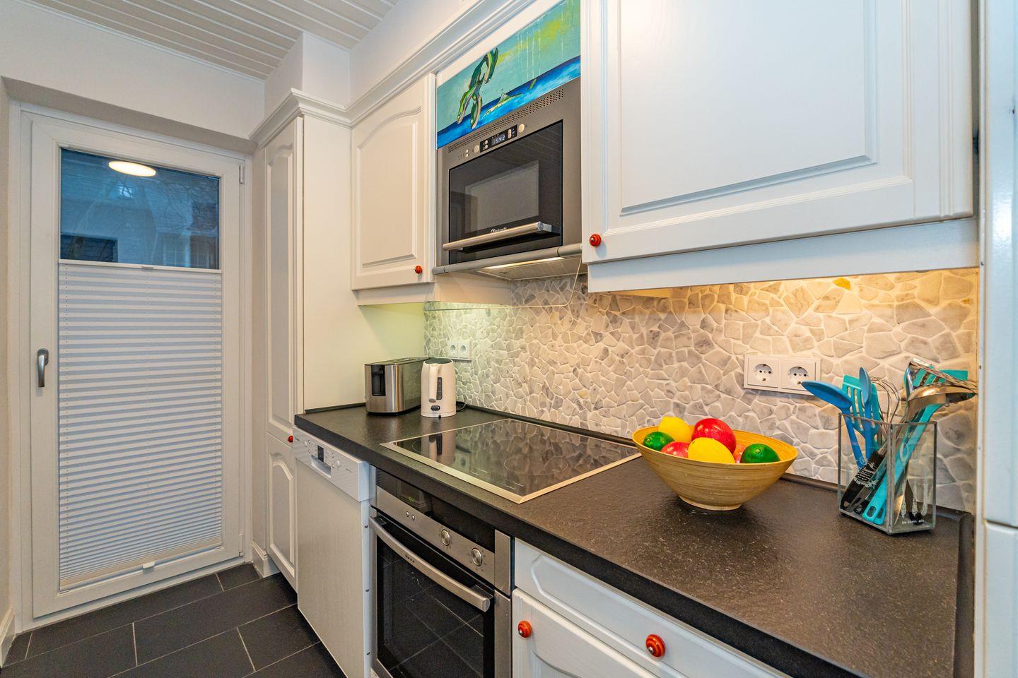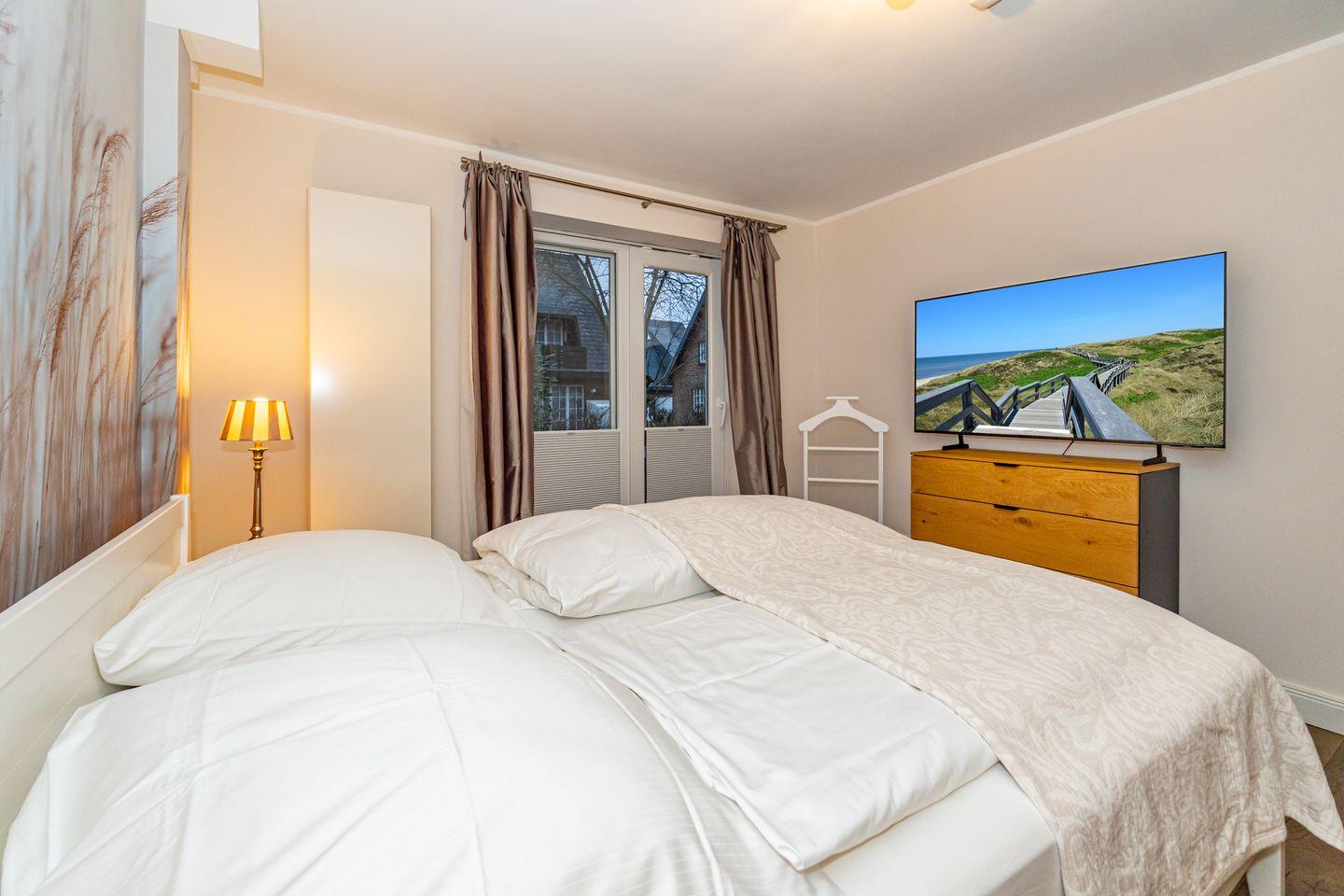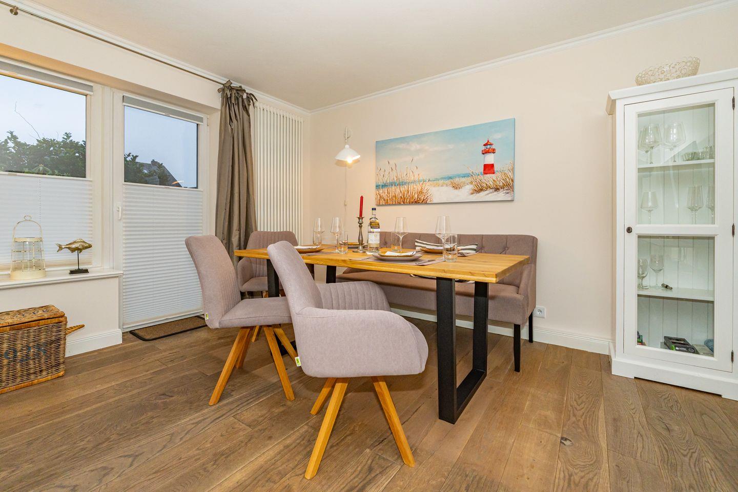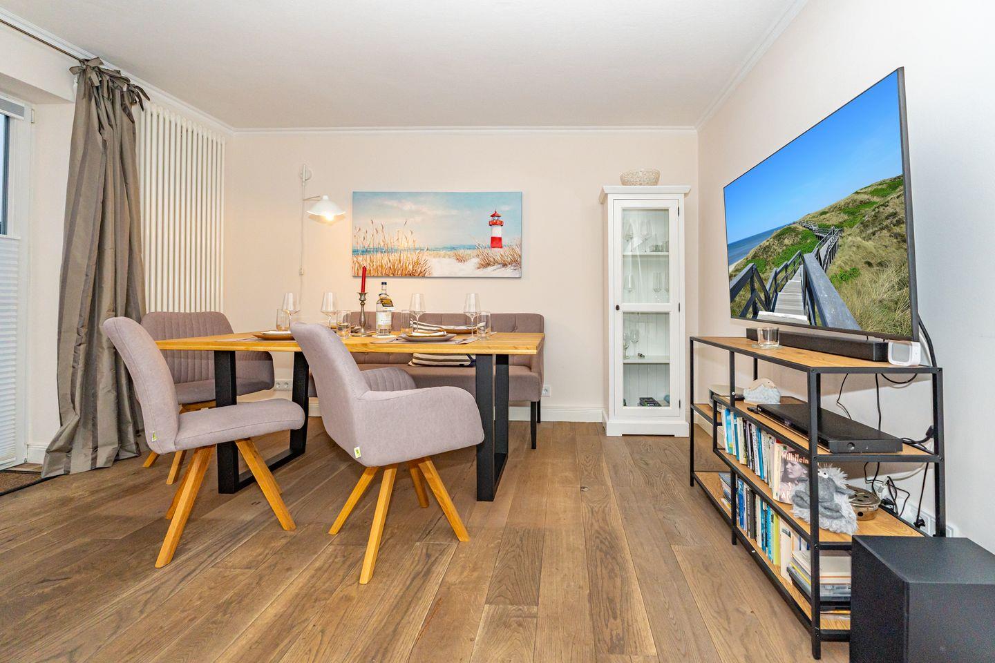 Die Ferienwohnung "Ferienliebe Strandkoje" ist eine komfortable und moderne Ferienwohnung in Wenningstedt-Braderup auf Sylt. Mit 52 m² Wohnfläche bietet dieses Domizil ausreichend Platz für bis zu drei Personen. Der freundliche Wohn- und Essbereich ist ausgestattet mit einem Esstisch, gemütlichen Sofa, Kaminofen und TV. Von hier haben Sie Zutritt zur Terrasse mit Gartenmöbeln (saisonal). Die Küche bietet Ihnen einen Backofen, Mikrowelle, Toaster, Wasserkocher, Kaffeefiltermaschine und Geschirrspüler. Das gemütliche Schlafzimmer verfügt über ein Doppelbett, TV und Kleiderschrank. Im Tageslicht Badezimmer bietet Ihnen ein Waschbecken, WC, Dusche und Fön. Nur 550 Meter trennen Sie vom herrlichen Sandstrand – der zu ausgedehnten Spaziergängen, Badeausflügen oder sportlichen Aktivitäten einlädt. Ein weiteres Plus ist der kostenfreie Privatparkplatz, der Ihnen auf dem Grundstück zur Verfügung steht. Ein Haustier ist nach vorheriger Anmeldung und gegen Gebühr (10€ pro Tag/pro Tier) erlaubt.
