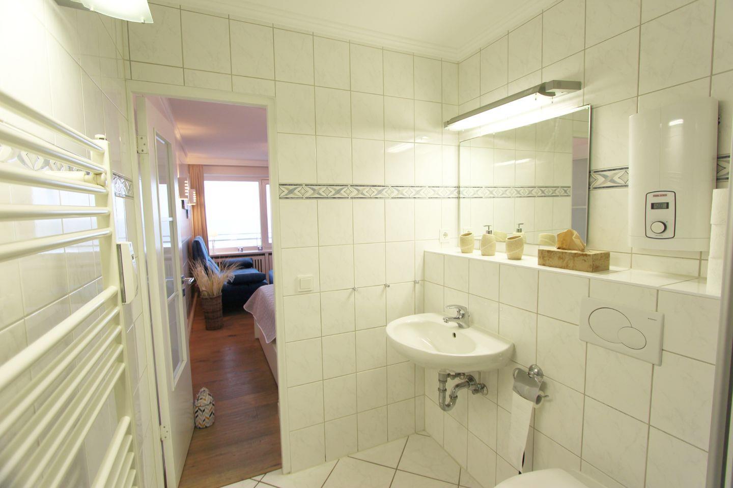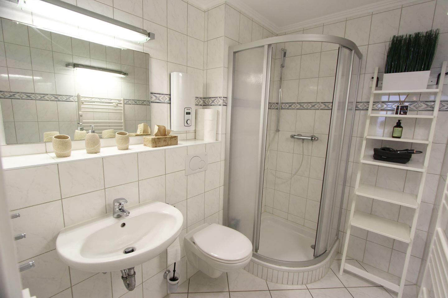 In dieser Ferienwohnung finden Sie ein großzügig gestaltetes Duschbad mit WC vor. Darüber hinaus gibt es Waschmaschine und Trockner als Münzgeräte für die allgemeine Nutzung im Haus.
