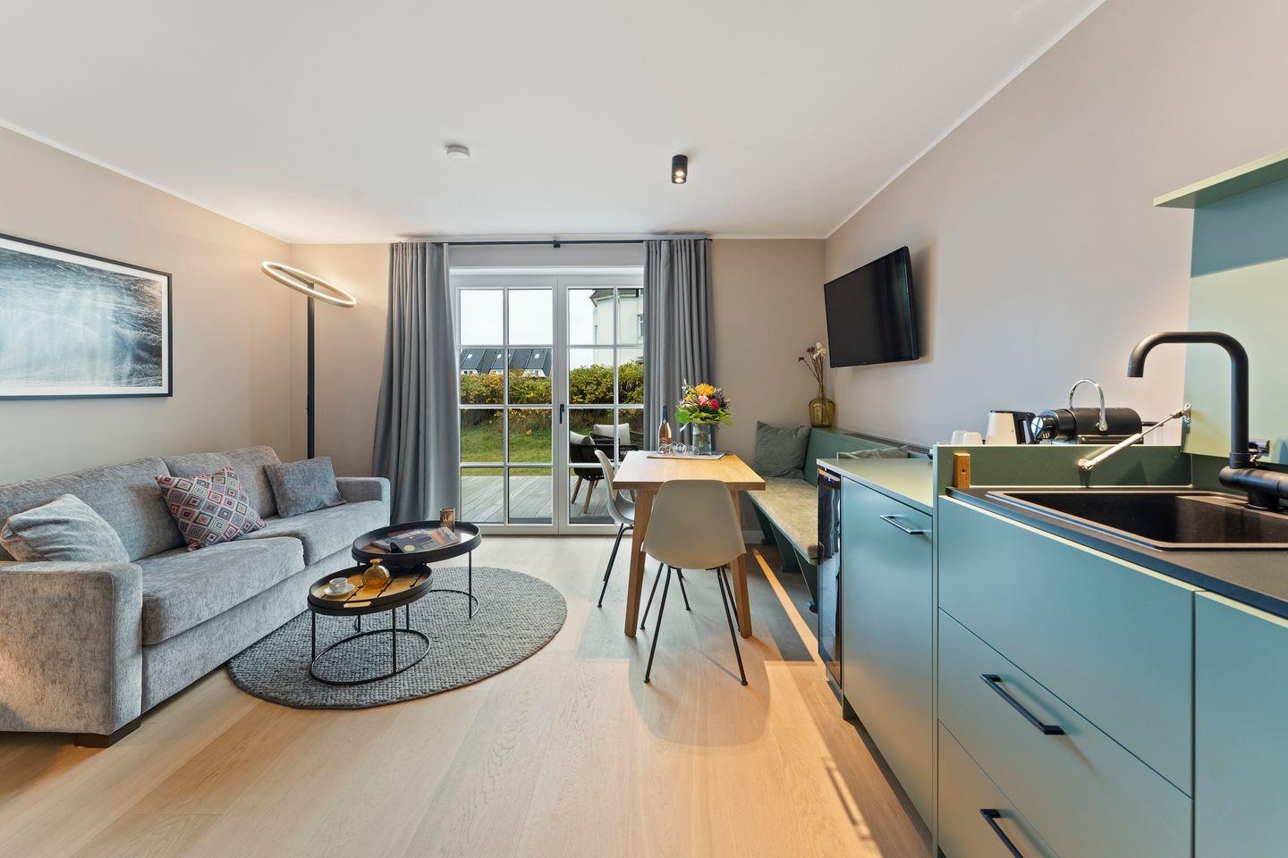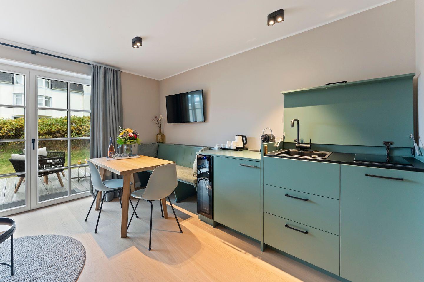 Die offene Pantry-Küche ist optimal für kleine kulinarische Auszeiten: Ob ein schnelles Frühstück mit frisch gebrühtem Nespresso-Kaffee oder ein leichtes Abendessen – dank kleinem Induktionskochfeld, Kühlschrank mit Gefrierfach und Geschirrspüler wird Kochen hier zum Vergnügen. Ein Weinkühlschrank sorgt für gekühlten Wein-Genuss.