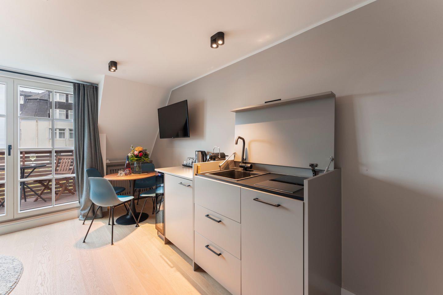 Die offene Pantry-Küche ist funktional und hochwertig ausgestattet – mit Induktionskochfeld, Kühlschrank mit Gefrierfach, Geschirrspüler, Weinkühlschrank und Nespresso-Kaffeemaschine. Perfekt für ein schnelles Frühstück oder kleine Mahlzeiten im Urlaub – ganz ohne Stress.