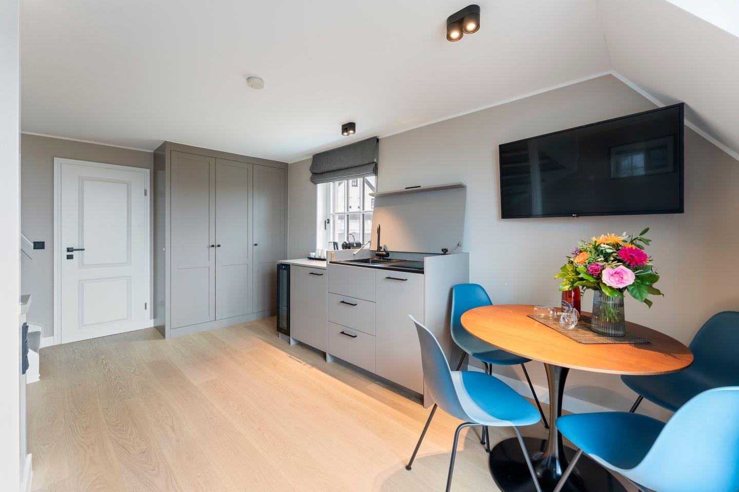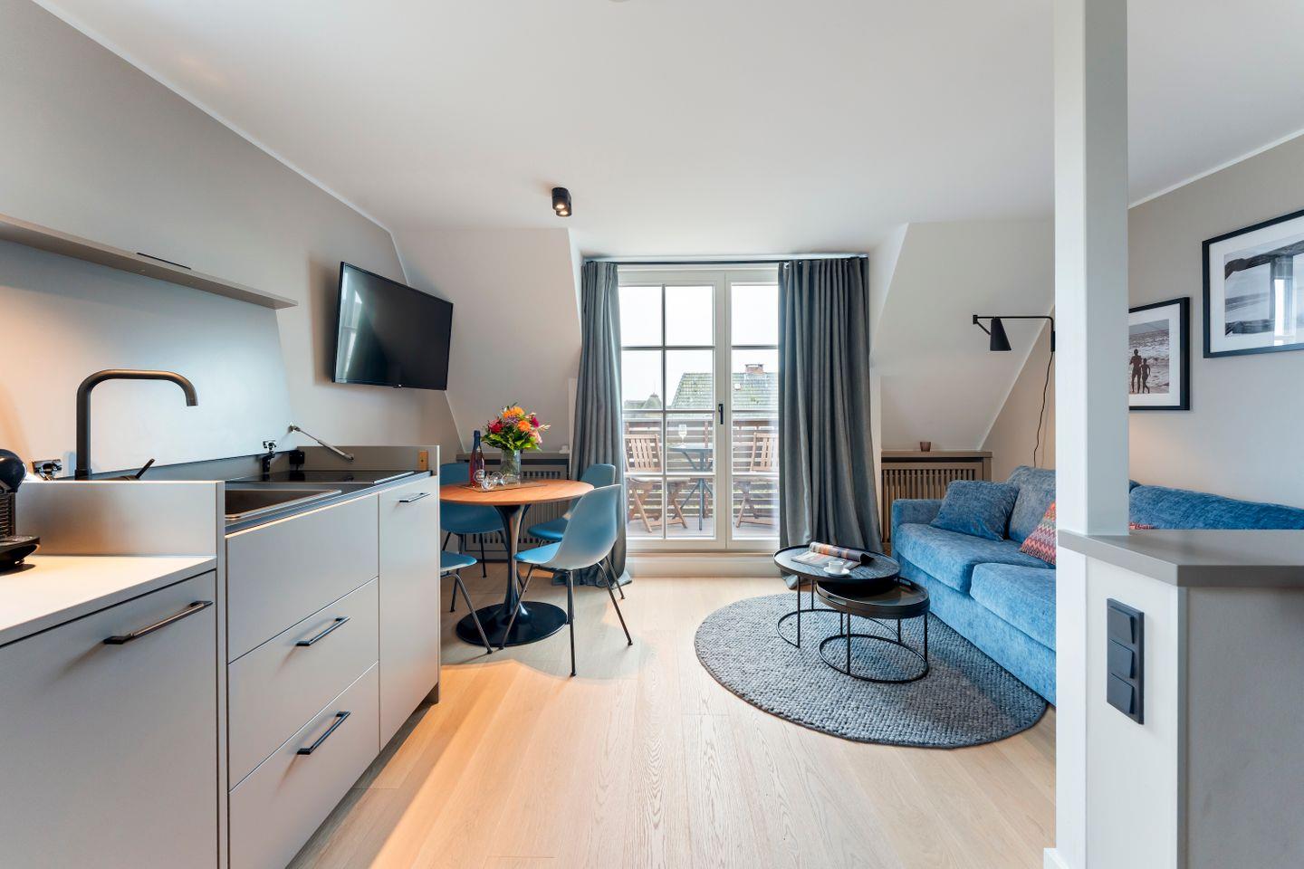 Die offene Pantry-Küche ist klein, aber fein – ideal für die Zubereitung eines entspannten Frühstücks oder leichter Gerichte. Ausgestattet mit Induktionskochfeld, Weinkühlschrank, Kühlschrank mit Gefrierfach, Geschirrspüler und Nespresso-Kaffeemaschine lässt sie keine Wünsche offen – hier beginnt der Tag mit Genuss.