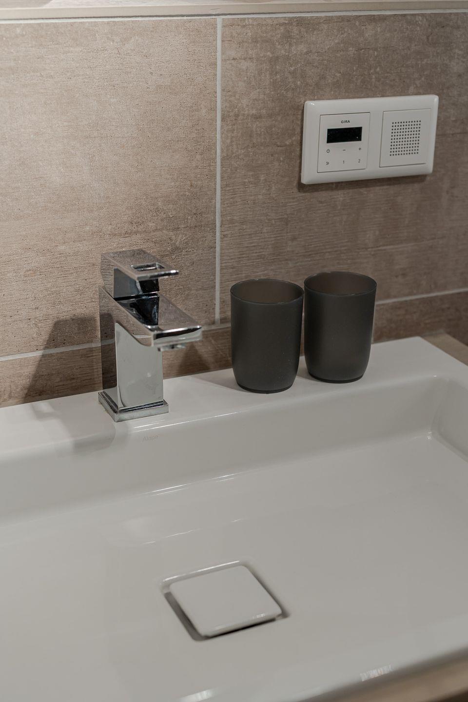 Die beiden Schlafzimmer im Untergeschoss liegen angenehm ruhig. Ein Schlafzimmer mit Doppelbett, ein weiteres mit Etagenbett – klar, gemütlich und bewusst zurückhaltend, damit man gut abschalten kann. Das Badezimmer ist modern und hochwertig ausgeführt und fügt sich stimmig in das Gesamtbild der Wohnung ein.